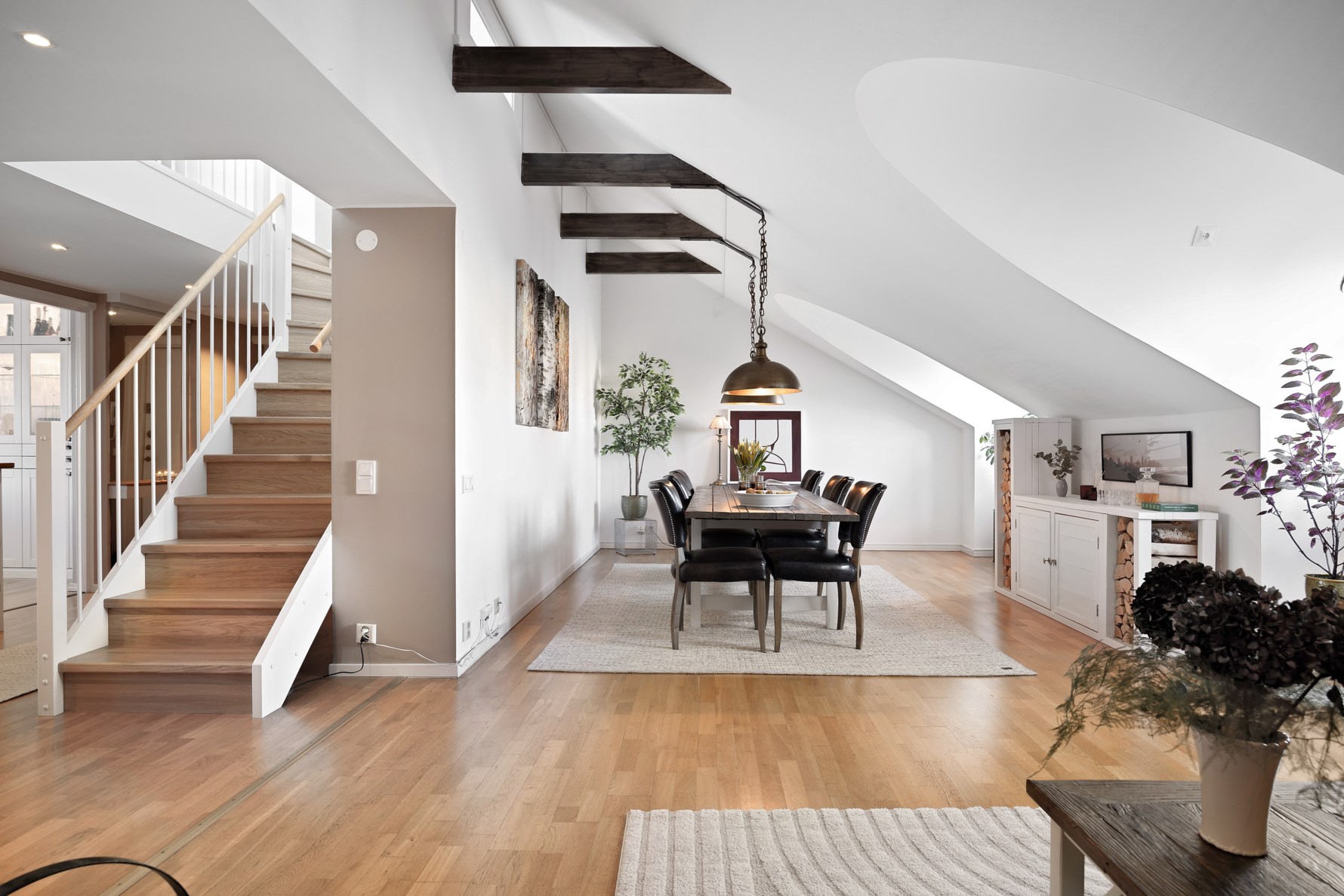 Rymligt och sällskapligt vardagsrum med fint ljusinsläpp från stora fönsterkupor. Tack vare rummets generösa utformning är möbleringsalternativen många och här ryms såväl en större soffgrupp som matplats för 6-8 personer. Rummet präglas av charmiga detaljer så som snedtak, takbjälkar samt en braskamin som höjer mysfaktorn under årets kyliga månader.