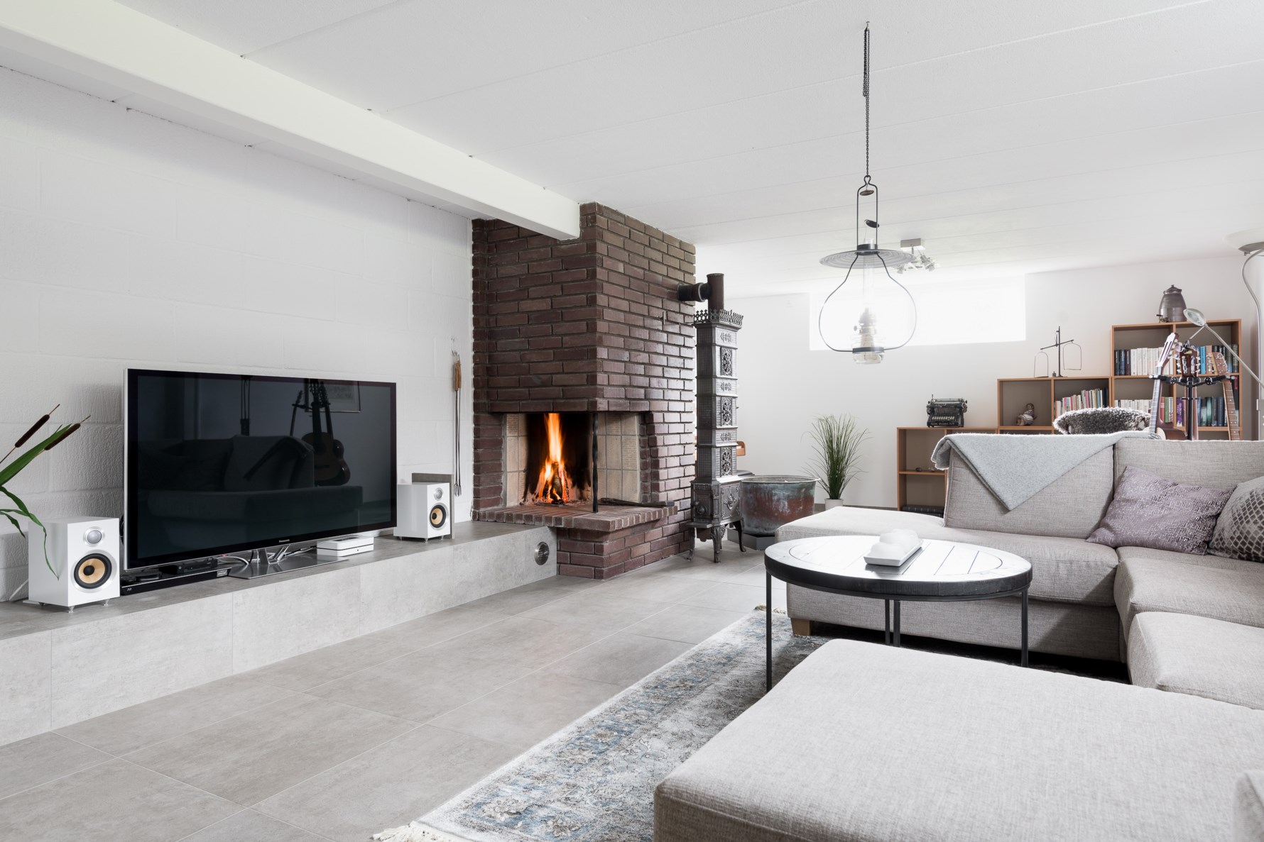 Trapphallen ner till källarvåningen pryds av ett glasparti vilket låter ljuset nå ut på båda plan. Trappan ner består av mjuka breda eksteg och tar oss ner till tv-rummet. Det fina klinkergolvet med underliggande vattenburen värme ger en komfort utöver det vanliga. Här finns förutom den öppna spisen även gott om fönster för ljusinsläpp och man har byggt en smakfull och praktisk bänk i samma material som golvet vilket ger en perfekt yta för tv:n. Rummet är generöst i storlek och här får man plats med exempelvis soffgrupp samt musikhörna.