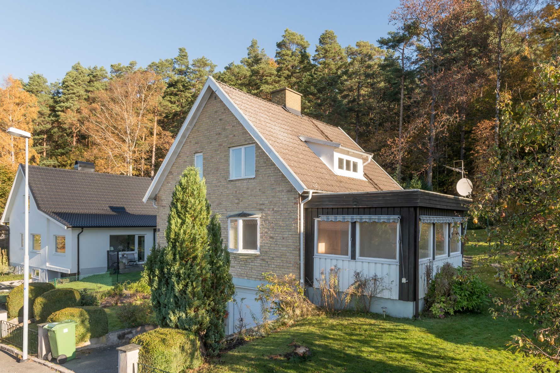 Vardagsrummet har fin karaktär med relativt nymålade väggar, tak samt parkettgolv. Öppen spis i vit puts samt tegel där man installerat en braskamin (ej i bruk) Rejäla fönsterpartier som ger fantastiskt med ljus och en härlig utsikt över grannskapet och trädgården. Det ena fönsterpartiet ut mot gatan har extra djupa fönsterkarmar i vinkel vilket ger extra charm till rummet. Vardagsrummet har en tillbyggnad vilket ger ett generöst rum med mycket ljusinsläpp. En altandörr leder ut till en uteplats mot husets baksida där man kan bygga en mindre altan eller terrass. Härifrån når man också husets lummiga trädgård.