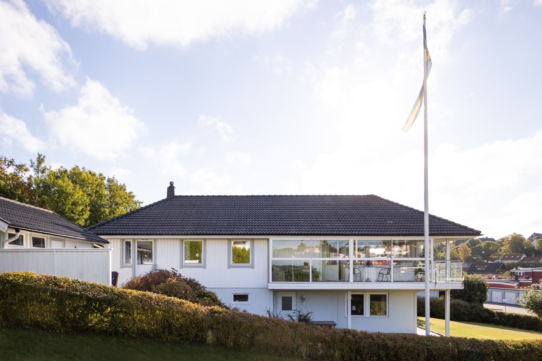 Utgång till altanen som sträcker sig runt huset med sol från morgon till kväll. Från altanen har man även en glimt ner mot Askimsviken. Altanen har dekorativa och underhållsfria räcken i glas och rostfritt.