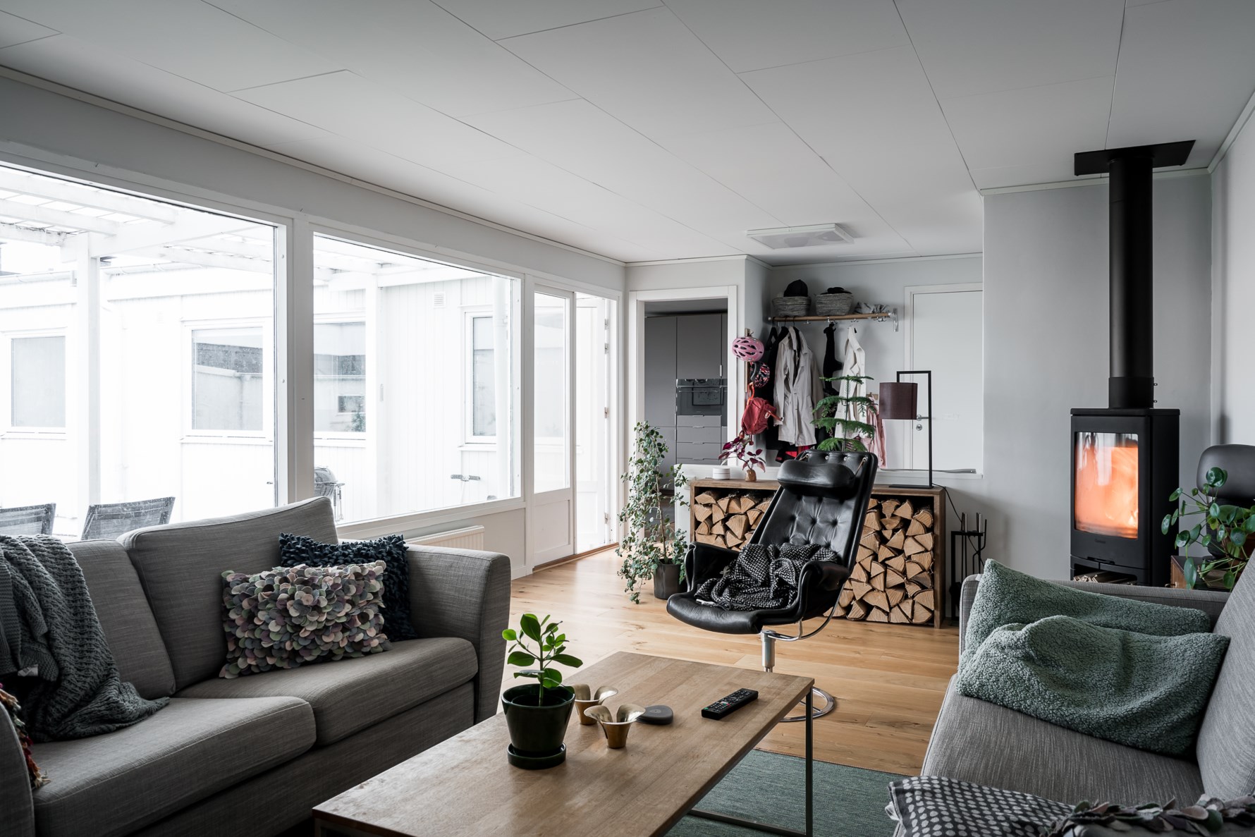 Vardagsrummet präglas av rikligt med ljusinsläpp från stora fönsterpartier som vetter ut mot atriumgården. Om sommaren kan dubbeldörrarna stå öppna och gränsen mellan inne och ute suddas ut. Uteplatsen ligger skyddad under tak så här kan det dukas upp till middag även om det regnar. Vardagsrummet kan inredas med generös soffgrupp och ena hörnet av rummet pryds av en braskamin som bidrar med både värme och hög mysfaktor. Golvet kläs av ekparkett och väggarna är målade i vitt.