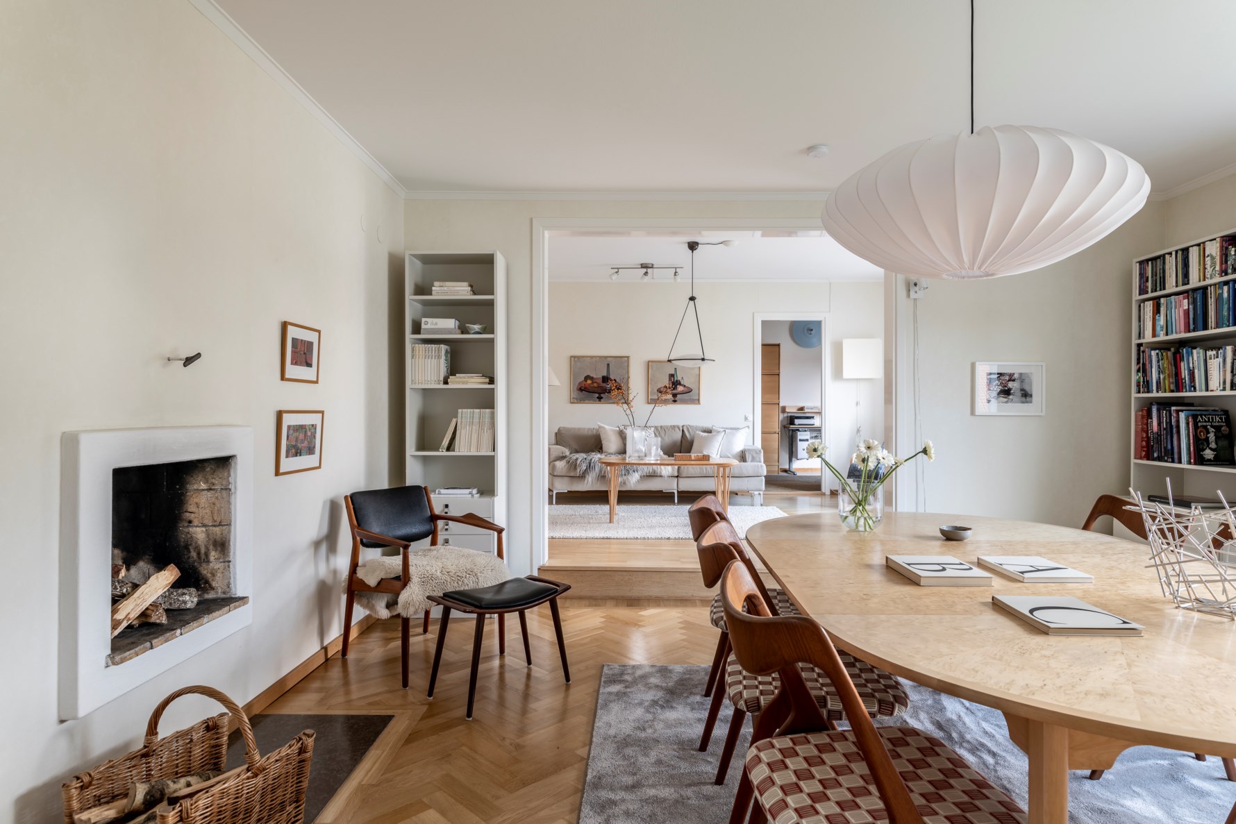 Innanför ytterdörren stiger ni in i en ljus och välkomnande hall. Väggarna kläs av vitmålad strukturtapet och på golvet ligger vacker fiskbensparkett i original. Redan här möts ni av ett lugn som präglar hela bostaden och ett fint ljusflöde som följer. En gästtoalett ligger intill och är inredd med wc och handfat.