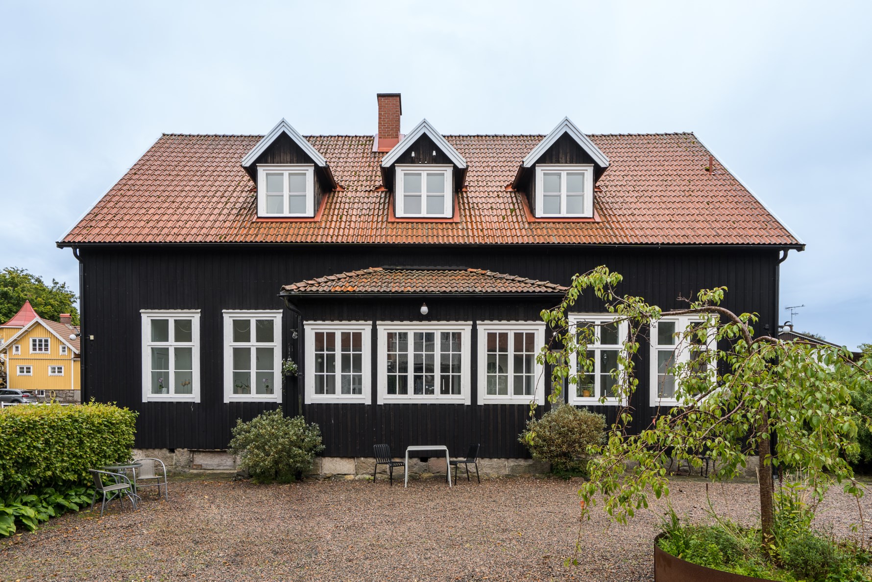 Sällskapsrum i öppen planlösning som huserar kök, matsal och vardagsrum. Storslaget minst sagt med generös takhöjd och flertalet spröjsade fönster på rad som gör att rummet fullkomligt badar i ljus. Matsalsbord för stora bjudningar ryms här, soffa, fåtöljer och bokhyllor. I ena hörnet står gjutjärnskaminen redo för höstens lite kyligare kvällar.