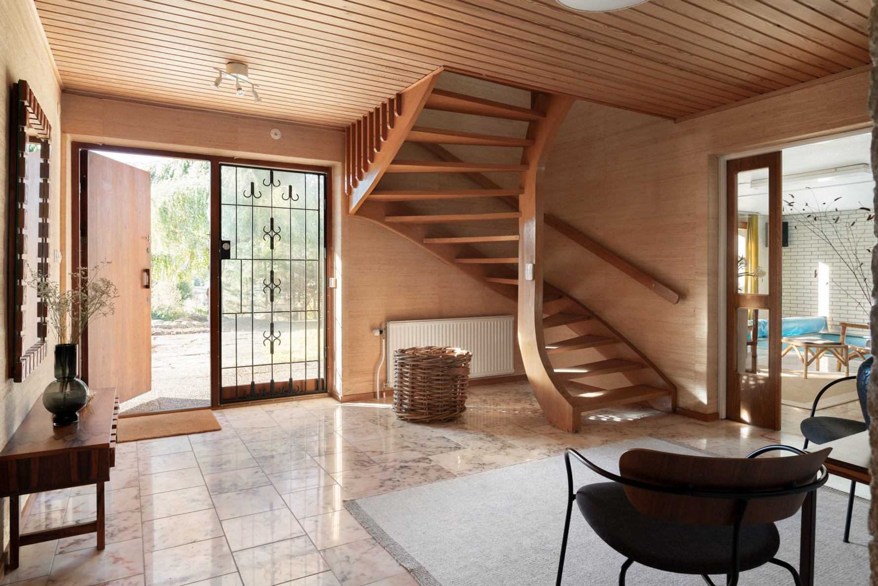 En ek-trappa i hallen leder oss upp till plan 2 som har ett spatiöst vardagsrum med öppen spis och fina parkettgolv samt utgång till en stor balkong i söder. Här finns även ett rum i vinkeln mellan vardagsrum och kök som har fönster i väster och med genomgång till ett klassiskt 60-tals kök i ljus ek (med följande vitvaror: spis, fläkt, kyl (sämre funktion), frys). Matplatsen i köket har en mysig eldstad i tegelväggen och ifrån detta rum har man möjlighet att gå ut till baksidan av huset och den skyddade uteplatsen i väster.