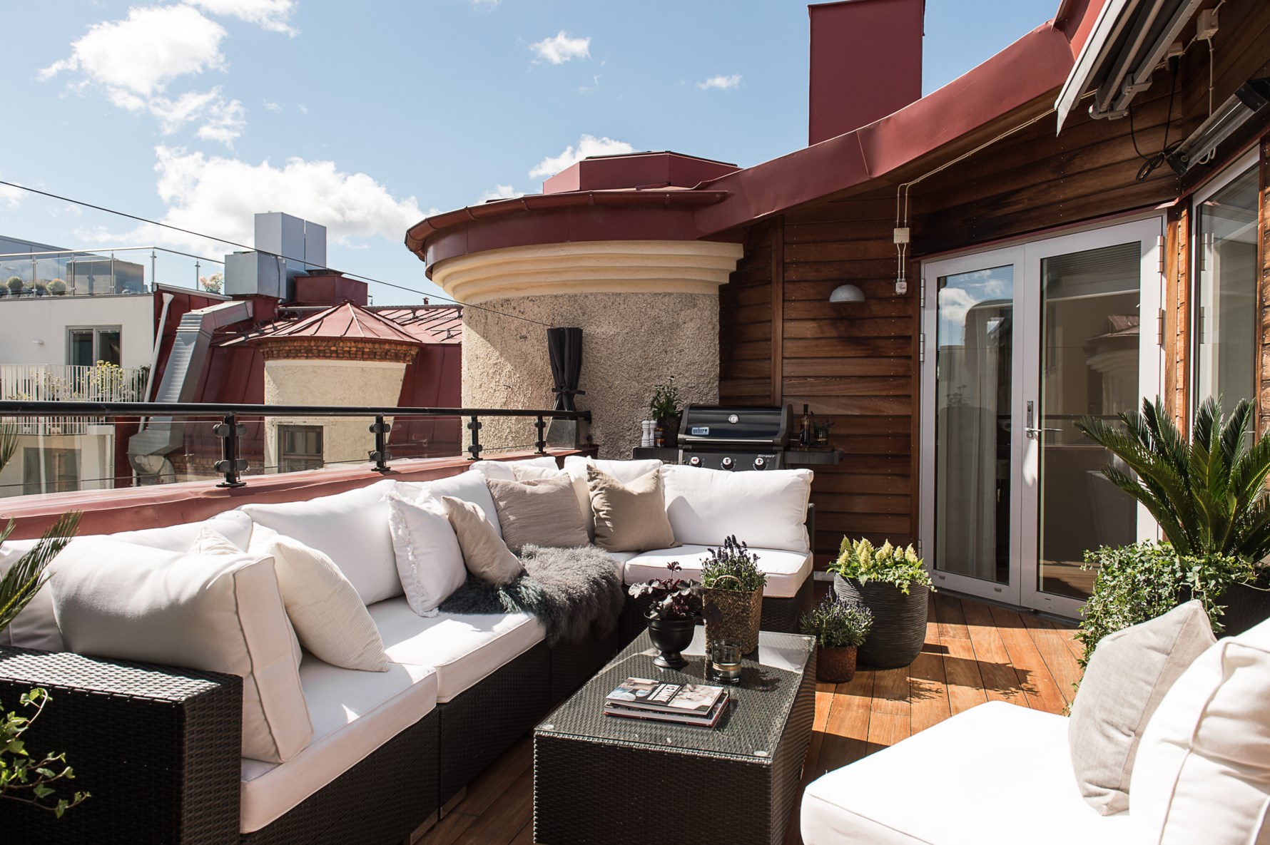 LOUNGE/KÖK i helt öppen miljö med ett underbart ljusinsläpp från de sex välvda fönsterkuporna och takfönster. Öppen spis i kalksten & smidesjärn designad av arkitekten Stig Börjesson centralt placerad. Utgång till takterrassen från såväl Master Bedroom som Lounge via skjutdörrar från världsledande Schüco. Takterrassen har elektriskt markistak och värmare för den som önskar förlänga säsongen.