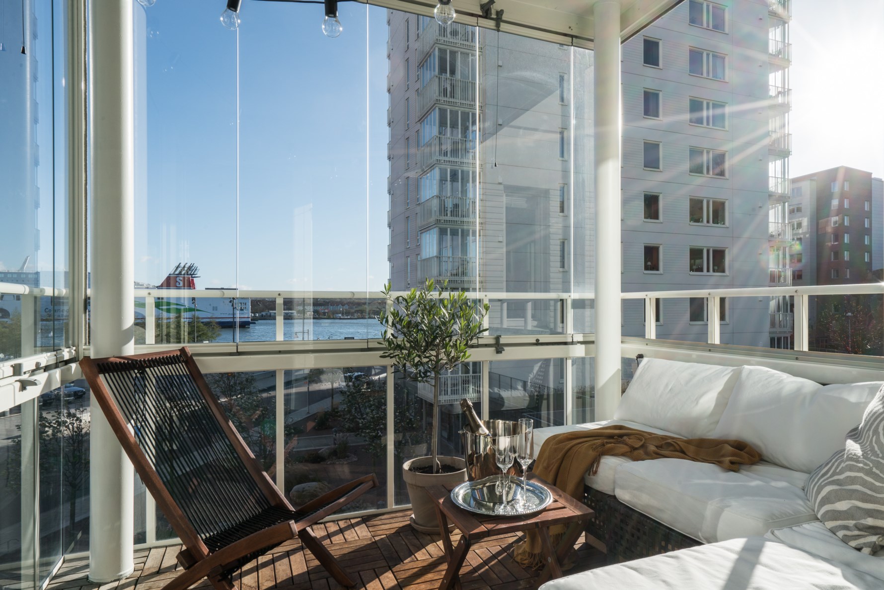 Luftiga sällskapsytor i gavelläge med öppen planlösning, fint ljusinsläpp från generösa fönster i två väderstreck samt fin vy över älven och Eriksbergsdockan. Härifrån nås lägenhetens inglasade balkong i soligt läge på första parkett precis vid bockkranen.
