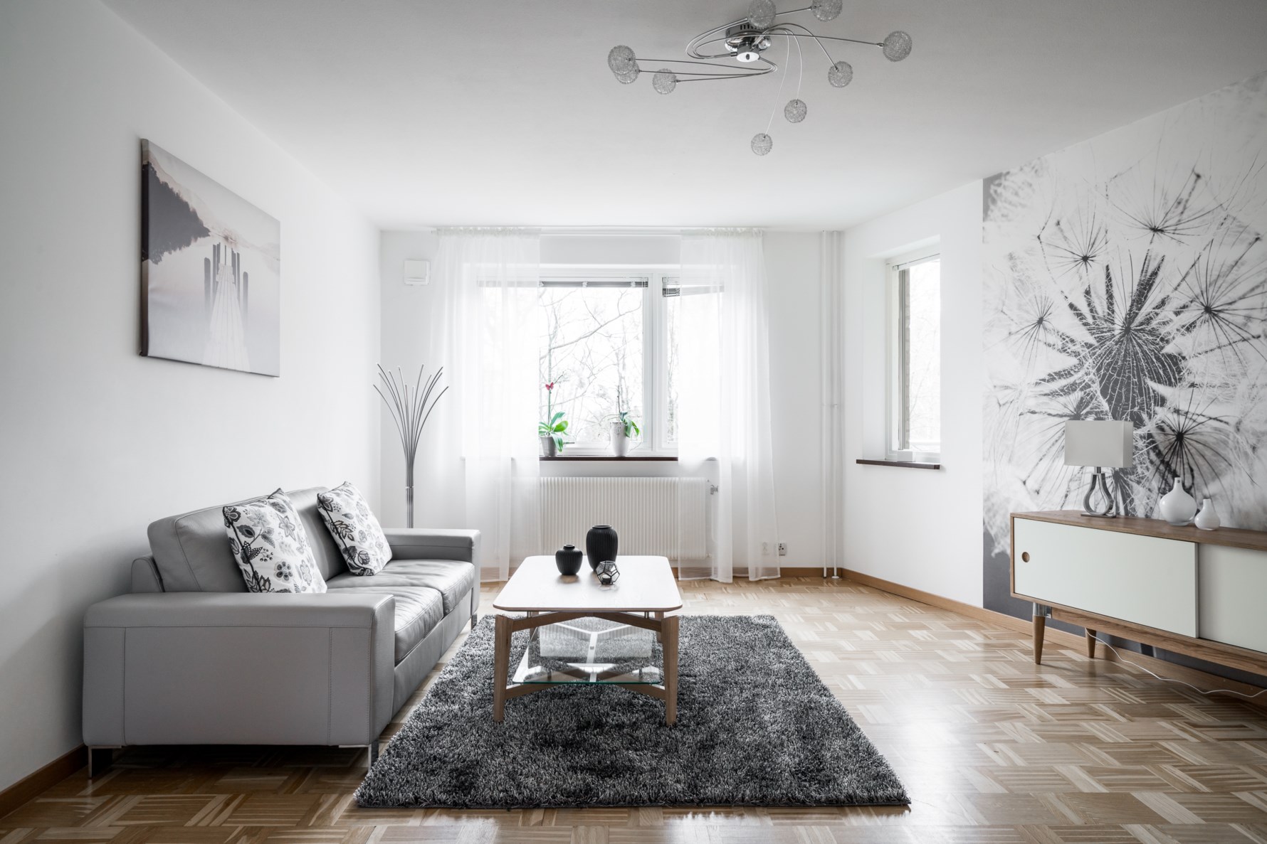 Generöst vardagsrum med fina vinklar, gavelläge och ljusinsläpp från fönster i två väderstreck. Vardagsrummet kan inredas med soffa, matplats och övrigt möblemang. Originalparkett i holländsk läggning och vita väggar med en fototapet. Delvis öppen planlösning mot köket vilket binder samman sällskapsytorna.