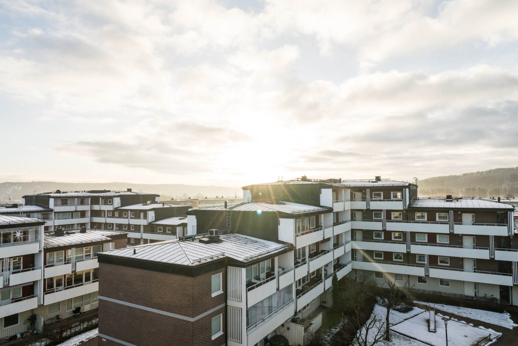 Vardagsrummet är stort och trivsamt och de generösa fönsterpartierna ger ett fantastiskt ljus. Härifrån nås lägenhetens stora balkong i härligt söderläge med vidsträckt utsikt över lekplatsen och takåsarna. Ekparkett och ljusa väggar.