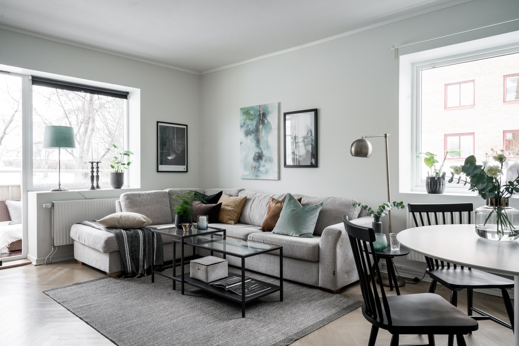 Ljust och lättmöblerat vardagsrum som kan inredas med soffa och matsalsbord. Generösa fönsterpartier i två väderstreck bidrar med ljusinsläpp och härifrån nås lägenhetens balkong som har ett soligt söderläge mot innergården. Fiskbensparkett och vitmålade väggar.