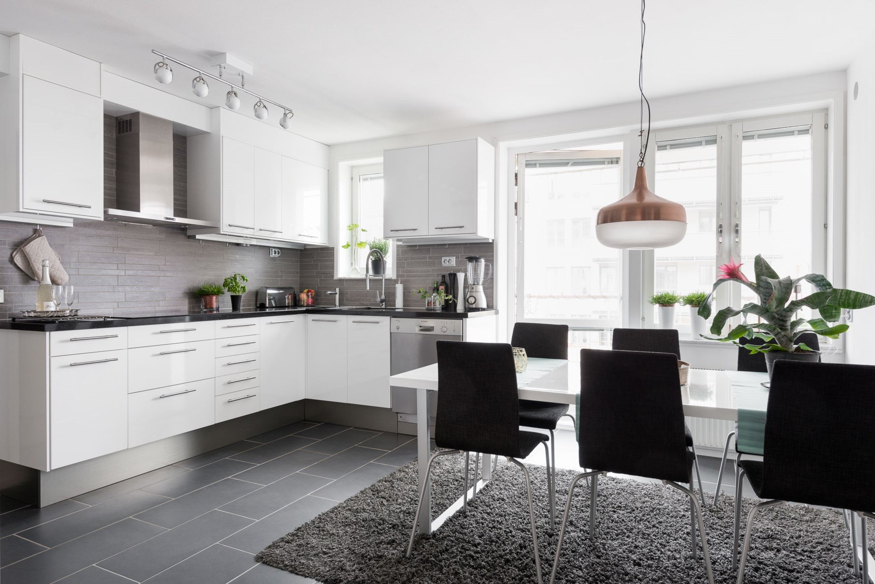 Köksdelen nås trevligt nog både från hall och vardagsrum. Även här är det rymligt med plats för ett större matbord för ca 10 personer. Grått klinkergolv och matchande stavkeramik som stänkskydd. Vita högblanka skåpsluckor med stålhandtag och arbetsbänk i massiv svart kompositsten. Vitvarorna består av större induktionshäll, inbyggd ugn och micro, fläkt, diskmaskin och hel kyl och frys, allt i rostfritt.