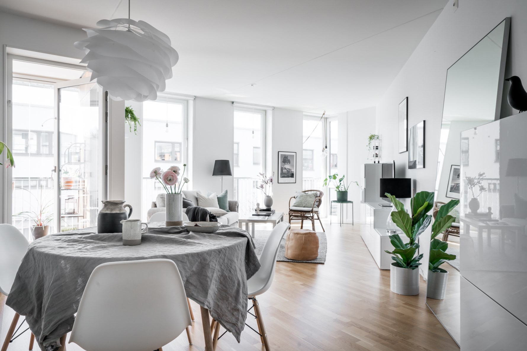 Ljust vardagsrum som präglas av fönster från golv till tak och spännande vinklar. Härifrån nås lägenhetens härliga inglasade balkong i västerläge där ni njuter av solen under hela eftermiddagen. Vardagsrummet kan inredas med soffa och matplats.