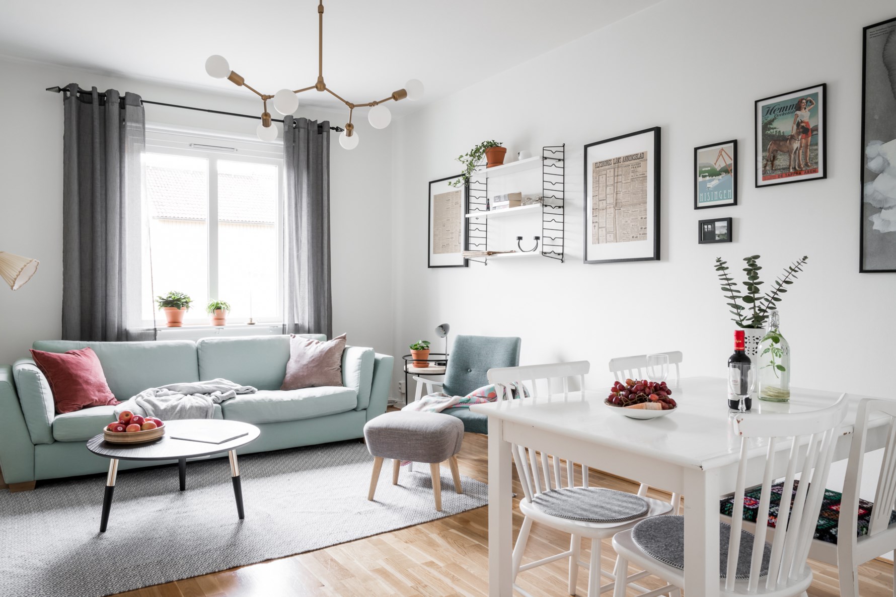 Vidare in finner ni vardagsrummet. En perfekt plats för umgänge i goda vänners lag. Generösa ytor inbjuder till en rad olika möbleringsalternativ, såväl för avslappnade kvällar i tv-soffan som trevliga sammankomster kring ett matsalsbord. Fönsterpartierna bjuder på ett härligt ljusinsläpp. Väggarna är målade i vitt och på golvet ligger ekparkett.