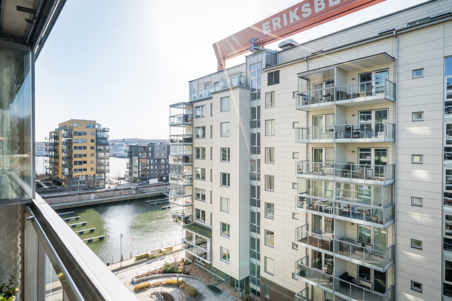 Vidare in i bostaden möts ni av det stora allrummet. Ett kombinerat kök med vardagsrum i en öppen härlig planlösning. här har en större soffgrupp med tillhörande möblering en självklar plats, likväl som ett matsalsbord för minst 8 personer. Hela bostaden har ett härligt ljusinsläpp tack vare flera fönsterpartier i olika väderstreck. Från vardagsrumsdelen når ni den större inglasade balkongen. Här kan ni möblera med loungemöbel och grill för att kunna njuta av en god middag under sommarkvällarna. Från balkongen har ni en fin utsikt ner över vattnet och hamninloppet.