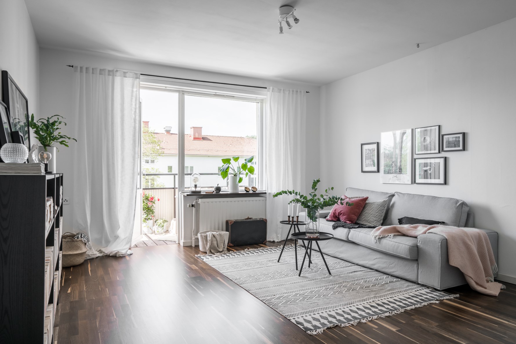 Vidare in möts ni av vardagsrummet. Ett luftigt rum som inger olika möbleringsalternativ som omfattar både en större soffgrupp tillsammans med tv-möbel. Det stora fönsterpartiet bjuder på ett härligt ljusinsläpp som reflekteras fint i de vitmålade väggarna. Från detta rum når ni även bostadens soliga balkong. Möblera gärna med bord och stolar för att enkelt kunna sitta ned och njuta av den lugna omgivningen i solens strålar.