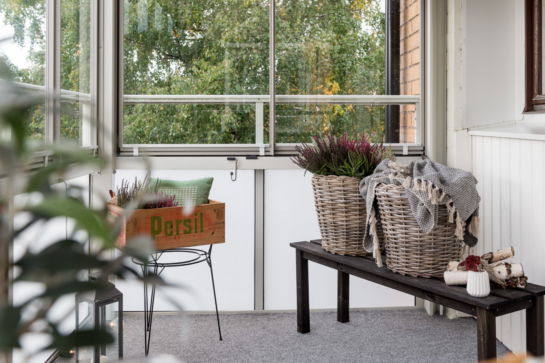 Därefter ligger det ljusa hemtrevliga vardagsrummet. Här finns fönster i två väderstreck vilket ger ett fint ljusinsläpp. Väggarna är tapetserade i en ljus äldre tapet och på golvet finns ekparkett i original. Från vardagsrummet nås den stora inglasade balkongen som är placerad i öster och söder vilket gör att ni njuter av solen under hela dagen.