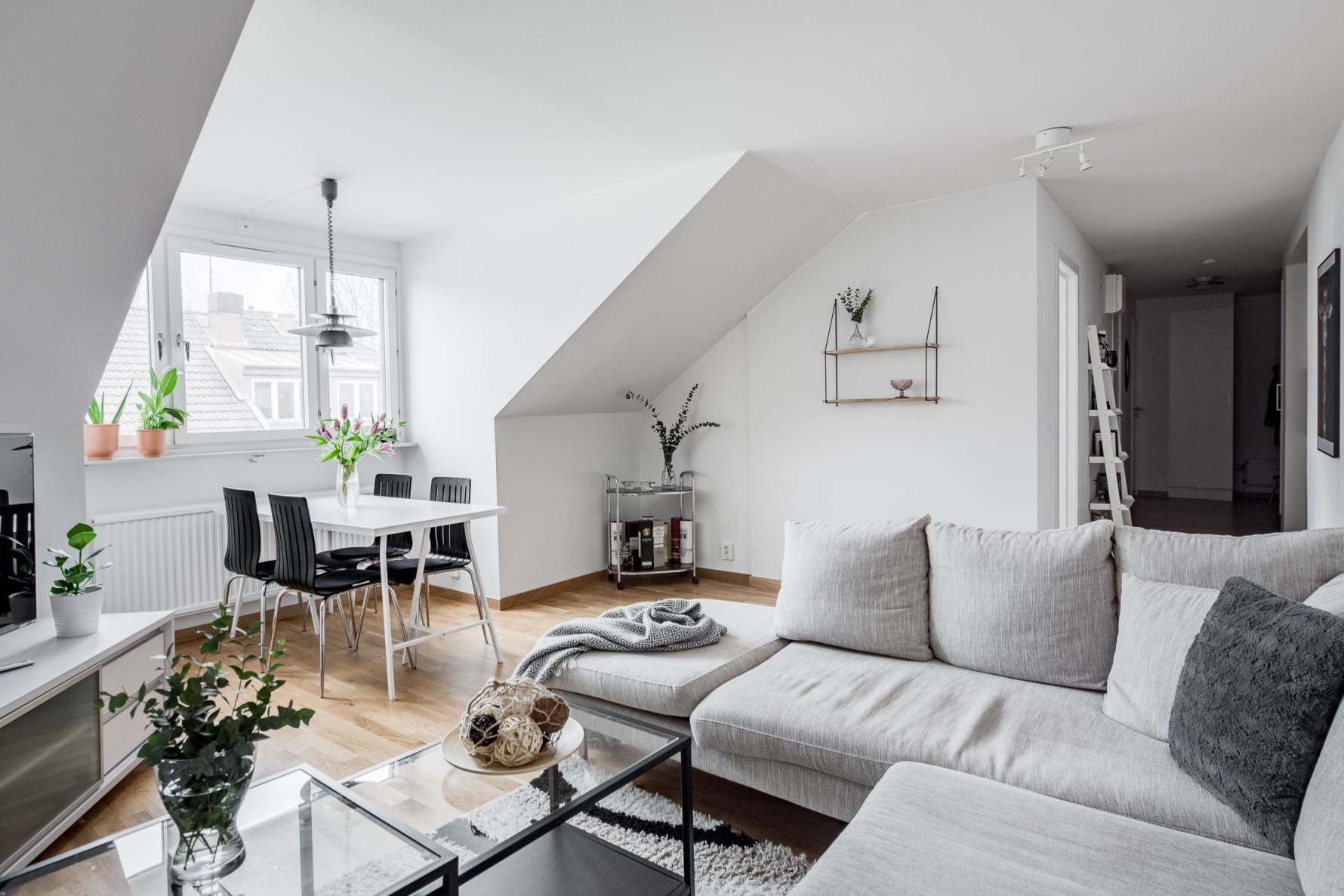 Vardagsrummet bjuder på ett fint ljus genom tre stora fönster. Intill finns den naturliga platsen för ett matbord, stort nog att dukas för fyra. Snedtaket ger extra karaktär åt det trivsamma rummet. Här ryms givetvis både soffa, soffbord och TV-möbel. På golvet ligger parkett och väggarna är vita.