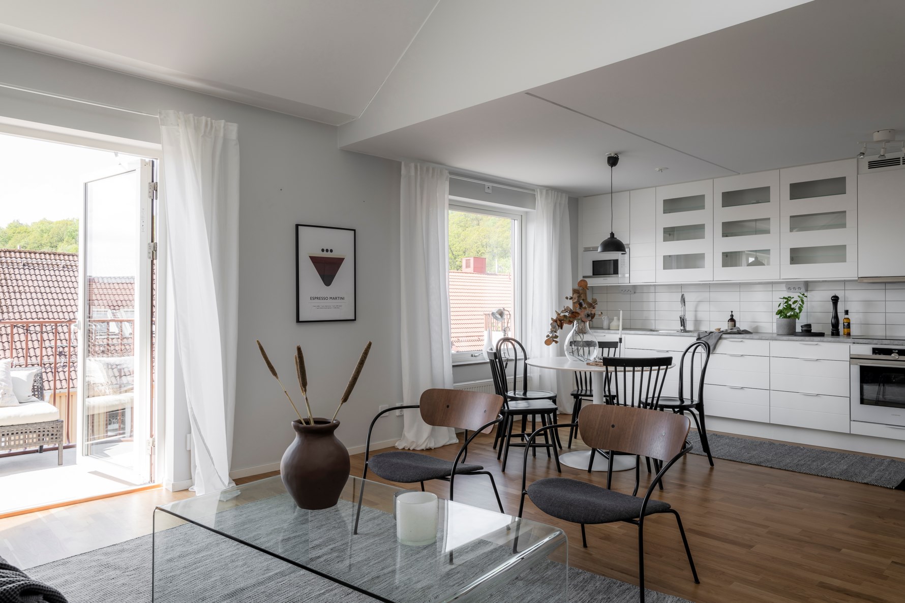 Vardagsrummet är ljust och har en härlig rymd då det delvis är öppet upp till andra våningen. Här finns gott om plats för soffa, bord och tv-möbel. Ett stort golvfönster och glasad altandörr leder ut till den möblerbara balkongen i soligt läge.