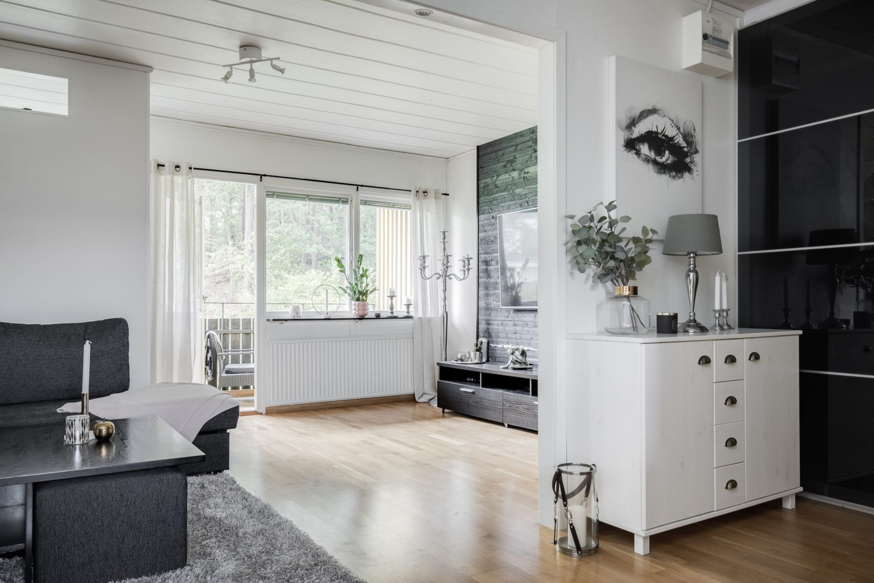 Innanför ytterdörren möts man av en hall med plats för avhängning och längre in i lägenheten finns förvaringsmöjligheter i en generös skjutdörrsgarderob. I hallen ligger praktiskt klinkergolv men i övrigt har lägenheten genomgående ekparkett och vitmålade väggar.