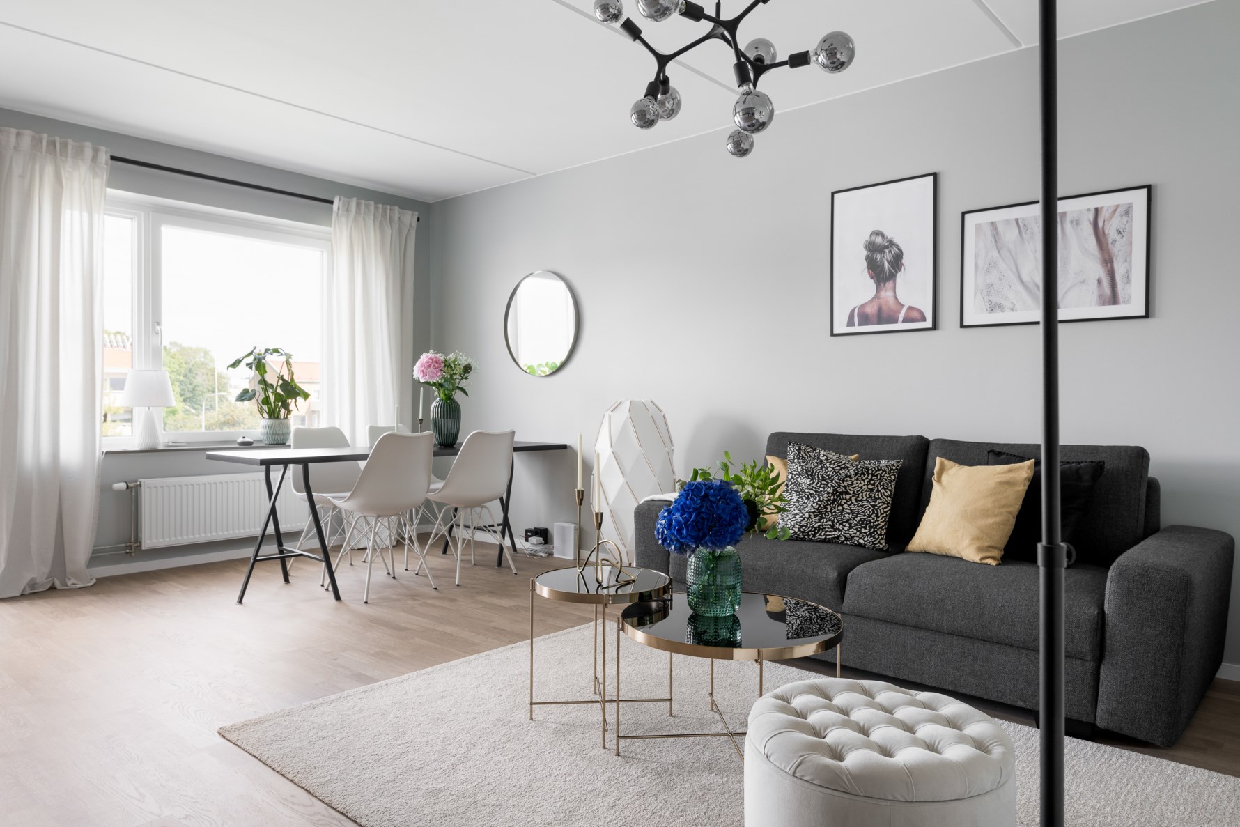 Ekparkett och gråa väggar. Gott om sällskapsytor där både soffgrupp och matsalsbord för ca 6 personer ryms. Från vardagsrummet kan man öppna den franska balkongen som en perfekt vädringsmöjlighet.