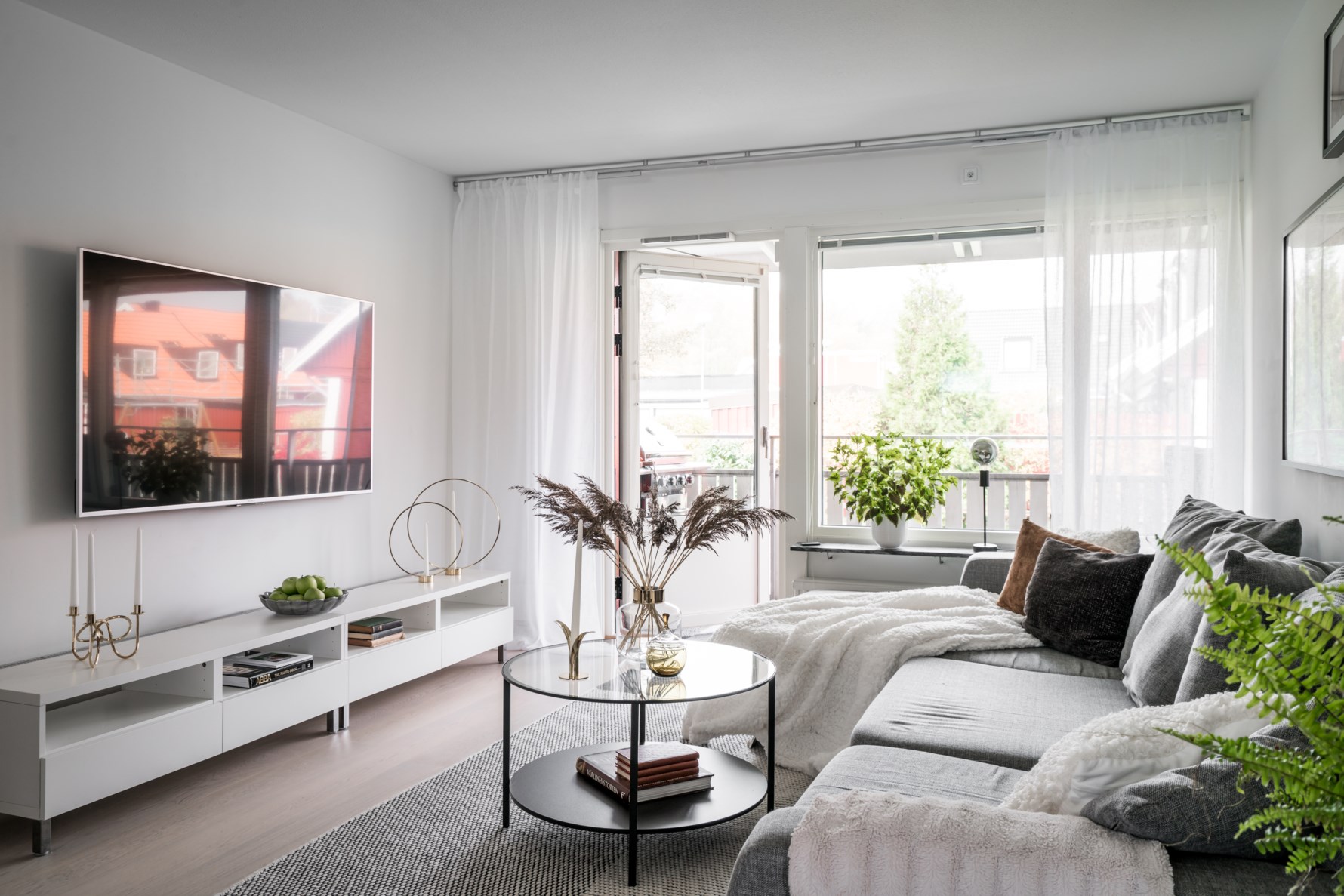 Vardagsrummet är rymligt och har ett härligt ljusinflöde tack vare det generösa fönsterpartiet. Golvet pryds av vitlaserad parkett och väggarna har ljusa toner. Mellan vardagsrum och kök är det en öppen planlösning vilket skapar en känsla av rymd. Här finns gott om plats för både soffgrupp och matgrupp. Härifrån har ni utgång till den rymliga balkongen i västerläge.