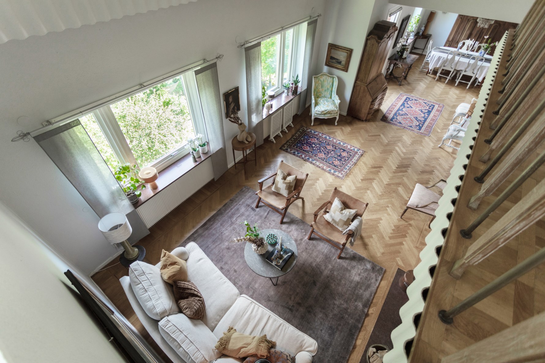 En trappa upp når ni andra våningen med magisk vy ner mot vardagsrummet/salongen. Rymden och atmosfären är unik och slående. I den övre hallen finns även en dörr som leder ut till trapphuset och vinden.