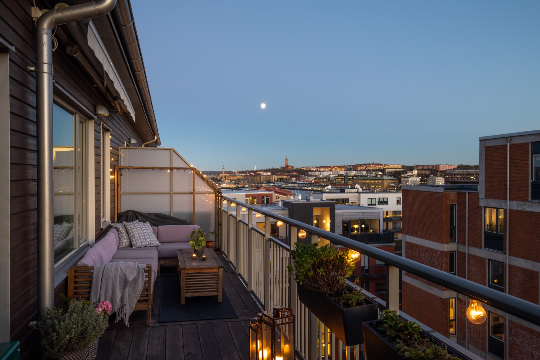 Härliga sällskapsytor i vardagsrum, matplats och kök i öppen planlösning. Fint ljusinsläpp från fönster mot söder och utgång till en stor, härlig balkong med utsikt mot älv och takåsar.