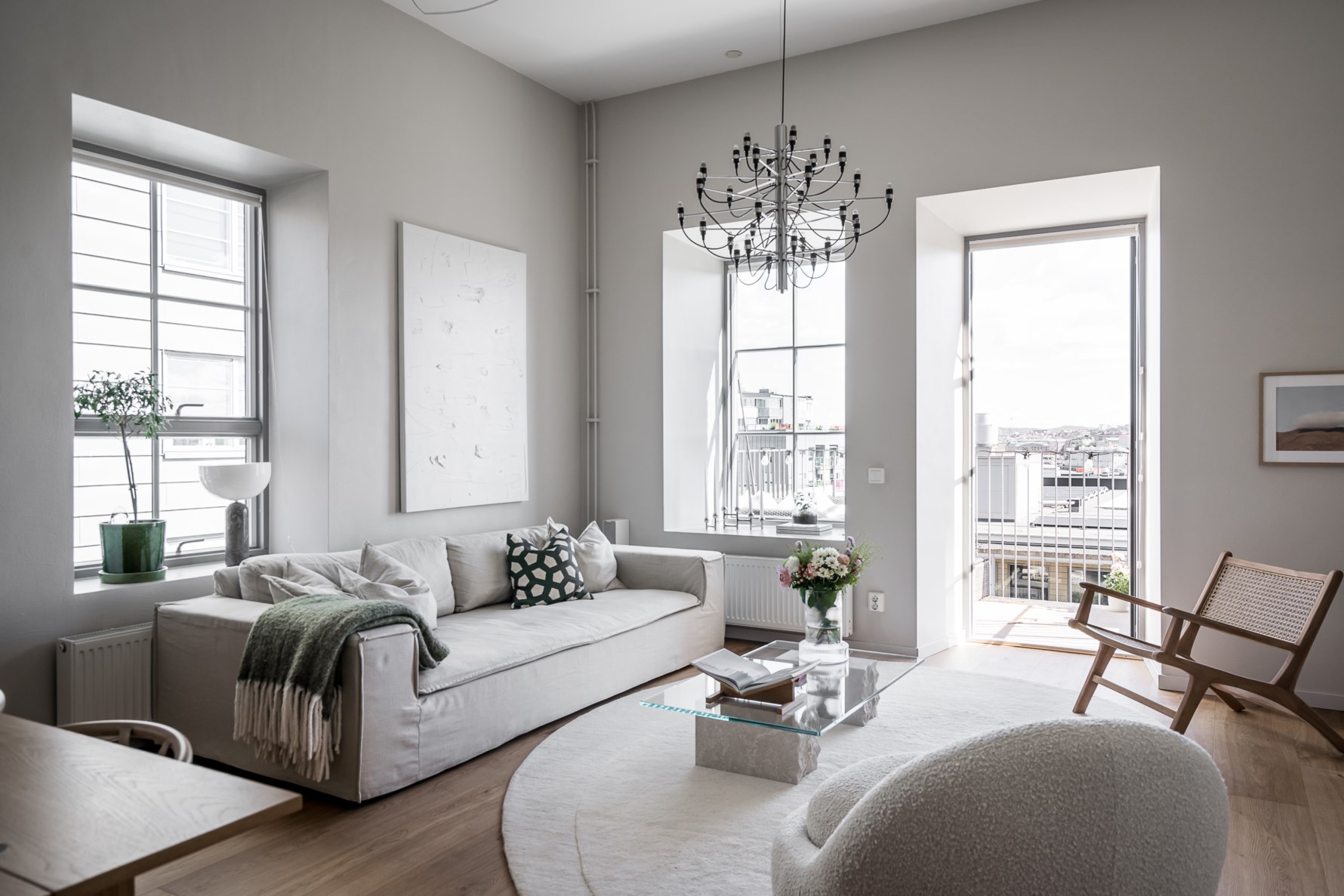 Generösa sällskapsytor med kök och vardagsrum i öppen planlösning som kan inredas med soffhörna och matsalsbord för stora middagssällskap. Eftertraktat gavelläge med ljusinsläpp från stora vackra spröjsade fönster med djupa nischer och utgång till en av bostadens balkonger som har milsvid utsikt över allt från hamninloppet till Masthuggskyrkan. Högt fritt läge där ni kan möblera med en loungegrupp och sitta ned för att njuta av en härlig frukost, eller varför inte ett glas vin till kvällen.