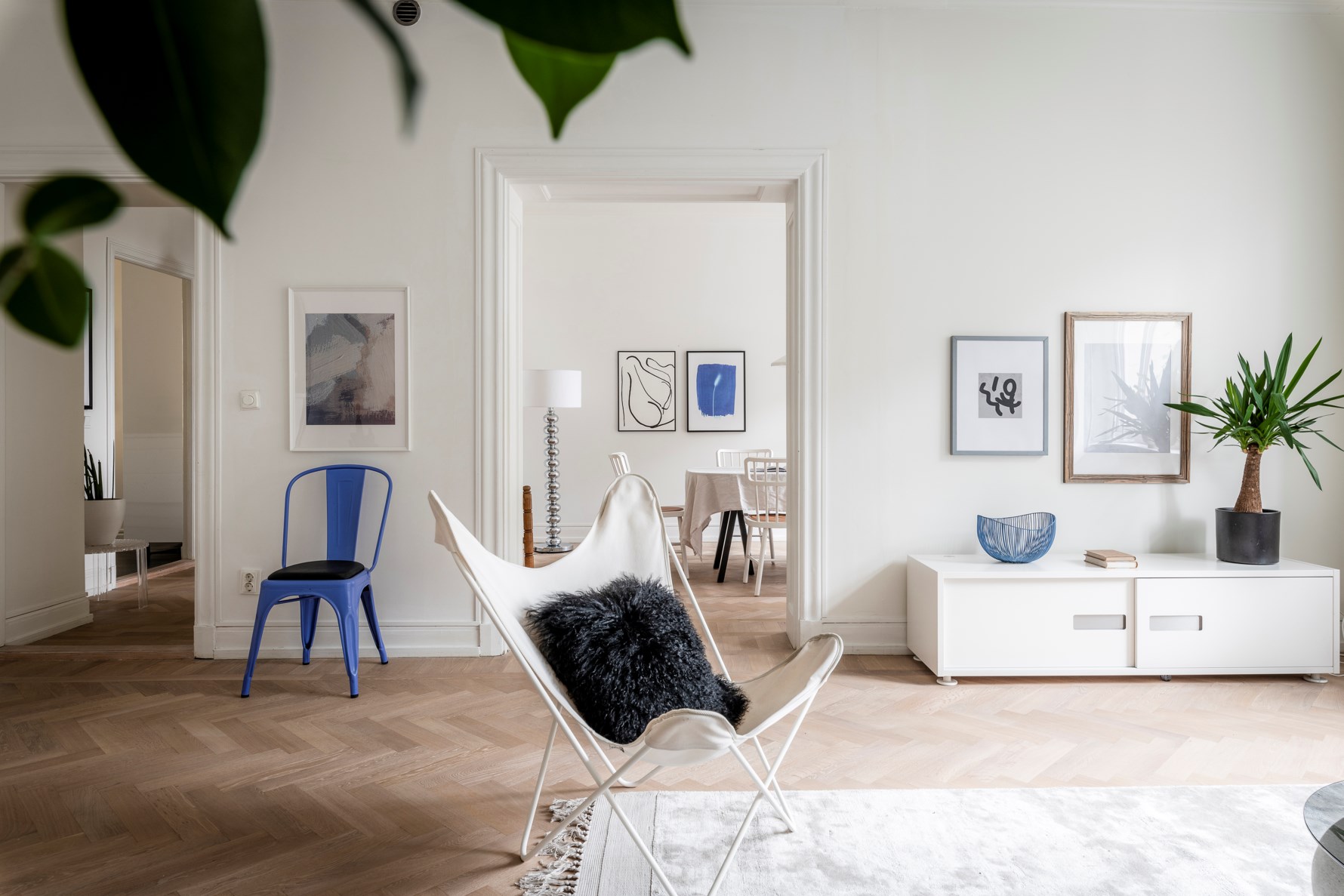 Genom ytterdörren kliver ni in i denna hemtrevliga bostad och redan här blir den generösa planlösningen påtaglig. Stor och luftig hall med plats för avhängning av ytterkläder samt förvaring i en inbyggd garderob. Vacker fiskbensparkett pryder golvet och fortsätter in i lägenheten. Genomgående ljusa väggar, höga fotlister och bevarade dörrkarmar skapar en känsla av att komma hem.