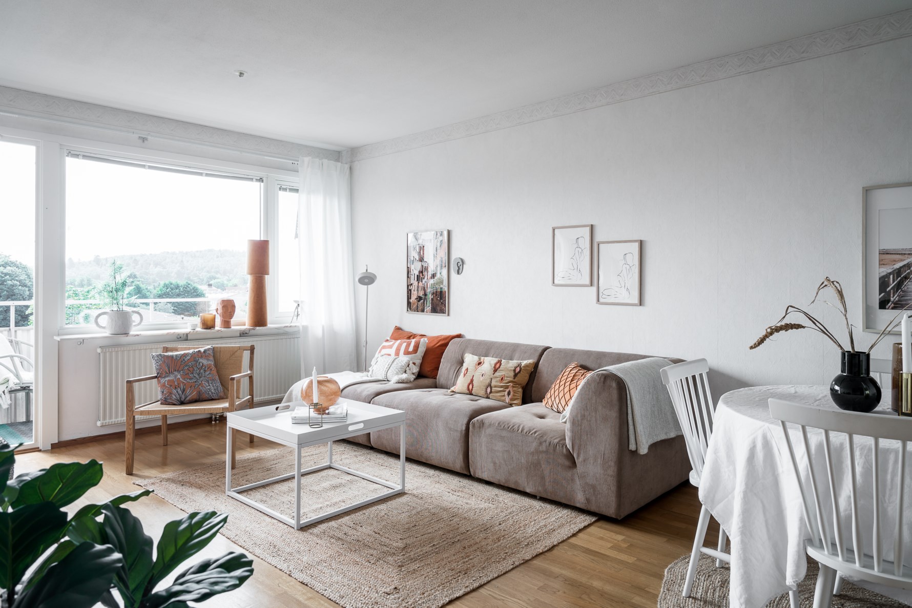 Vidare in finner ni bostadens luftiga vardagsrum. Ljusinsläppet är generöst tack vare ett stort fönsterparti samt utgång till balkong i söderläge. I vardagsrummet ryms med lätthet såväl soffgrupp med tillhörande möblemang samt matplats. Golvet pryds av parkett och väggarna är tapetserade.