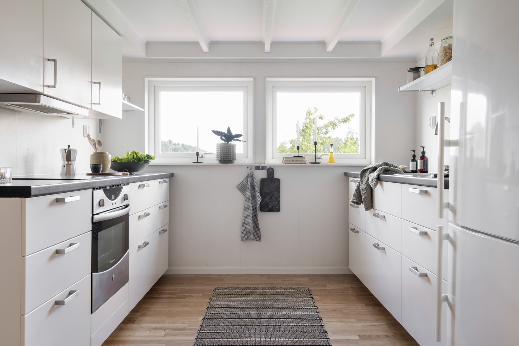 Ljust och funktionellt arbetskök med gott om förvaring och bra arbetsytor. Stilren köksinredning i vitt kombineras med bänkytor i mörkgrått. Köket är utrustat med glaskeramikhäll, fläkt, inbyggnadsugn, inbyggnadsmicro samt kyl med frys. Två fönster bidrar med ljusinsläpp. Öppen planlösning mot vardagsrummet.