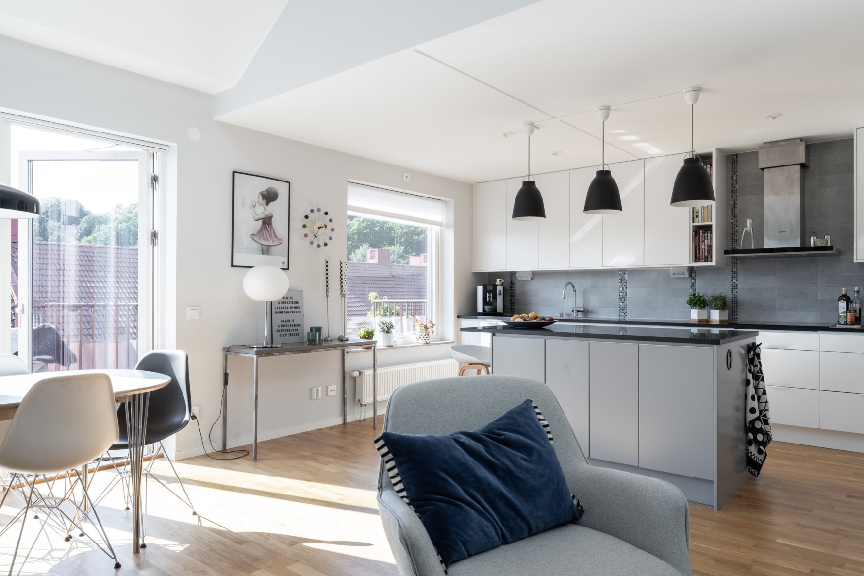 Det stilrena Vedumköket är i öppen planlösning med vardagsrummet. Bakom de vita släta luckorna och tre vitrinskåpen finns gott om förvaring då överskåpen går ända upp till taket. En både snygg och praktisk köksö ger extra förvarings- såväl som arbetsytor och här gömmer sig även en vinkyl. Ovan den svarta bänkskivan i sten sitter liggande kakelplattor. Alla vitvaror från Siemens går i vitt och består av induktionshäll, vägghängd fläkt, inbyggd mikro, ugn, diskmaskin samt kyl/frys. Invid fönstret finns plats för matbord och stolar.