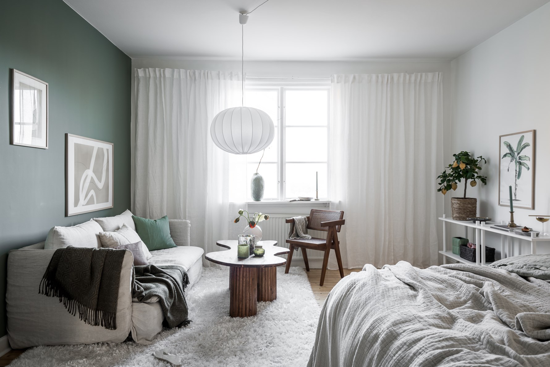 Ljust och trivsamt allrum som präglas av rikligt med ljusinsläpp från fönstret i tidsenlig stil. Rummet är rymligt och tillsammans med den väl tilltagna takhöjden fås en luftig känsla. Plats finns för säng samt soffgrupp med tillhörande möblemang. Vill man så ryms dessutom ett skrivbord - perfekt för studenten eller hemmajobbaren! Golvet täcks av fint plankgolv i original och väggarna är vita förutom ett parti som är målat i en behaglig grön ton.