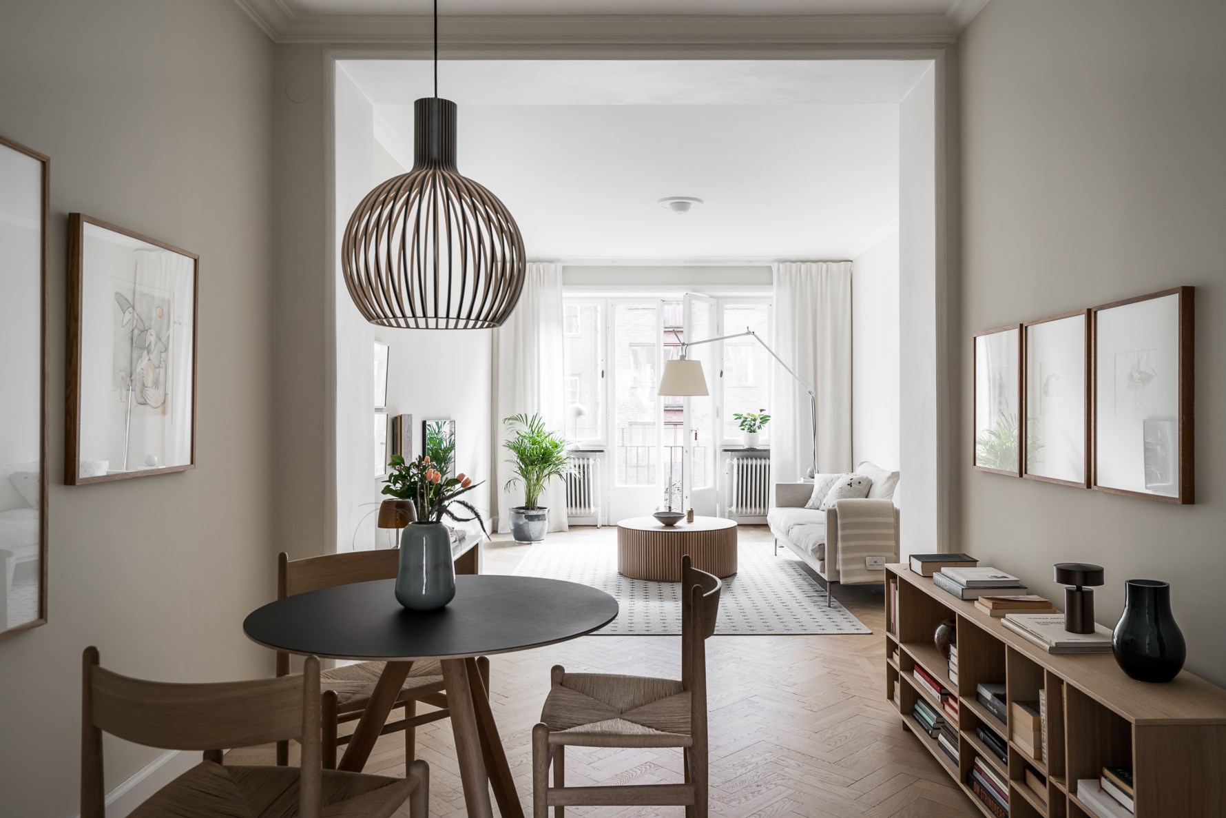 Till vänster från hallen finner ni bostadens kök som totalrenoverats under 2022 och bjuder in till härlig matlagning. Köket har köksinredning från Picky Living som kombineras med bänkskivor och stänkskydd i Gotländsk kalksten. Underlimmad extra stor vask från Franke samt tvåhålsblandare från Dornbracht. Den maskinella utrustningen består av induktionshäll från Electrolux, inbyggnadsugn med varmluftsfunktion från Smeg, kolfilterfläkt från Piccante samt integrerad diskmaskin och integrerad kyl med frys från Electrolux. Samtliga vitvaror installerades 2022. Köket erbjuder väldigt mycket förvaring, platsbyggd sittbänk samt utrymme för en matplats för fyra personer. Ett generöst fönsterparti bidrar med ljusinsläpp och utsikt mot den lummiga innergården.