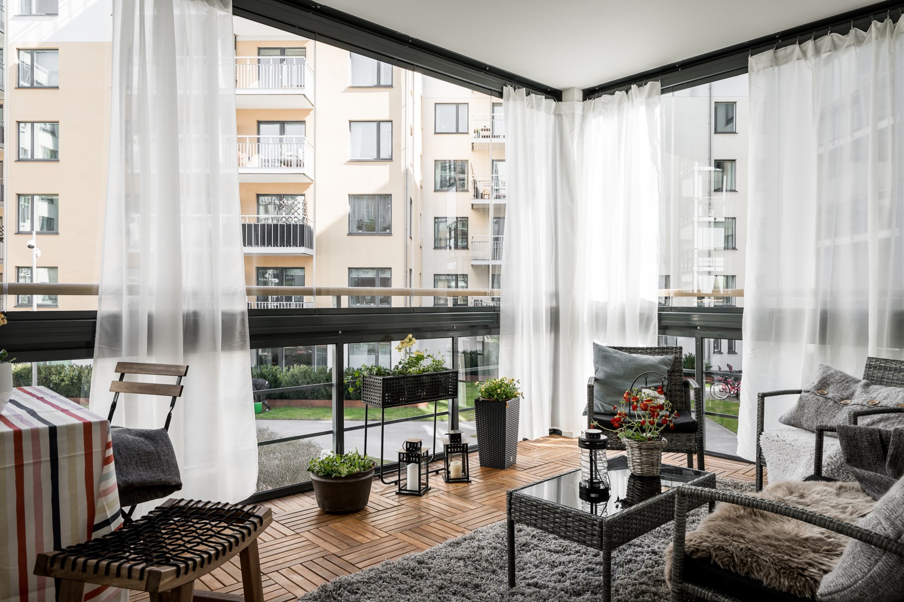 Innanför vardagsrummet ligger sovrummet som nås via två skjutdörrar. Mysigt sovrum som är beläget mot den lugna innergården och har ljusinsläpp från två höga fönsterpartier. Härifrån nås lägenhetens stora balkong med öppningsbar inglasning som blir som ett extra rum. Balkongen kan inredas med både matplats och loungemöbler. Sovrummet har plats för dubbelsäng och goda förvaringsmöjligheter finns i form av en skjutdörrsgarderob. Golvet kläs av ekparkett och väggarna samt garderobsdörrarna är målade i en behaglig grön ton.