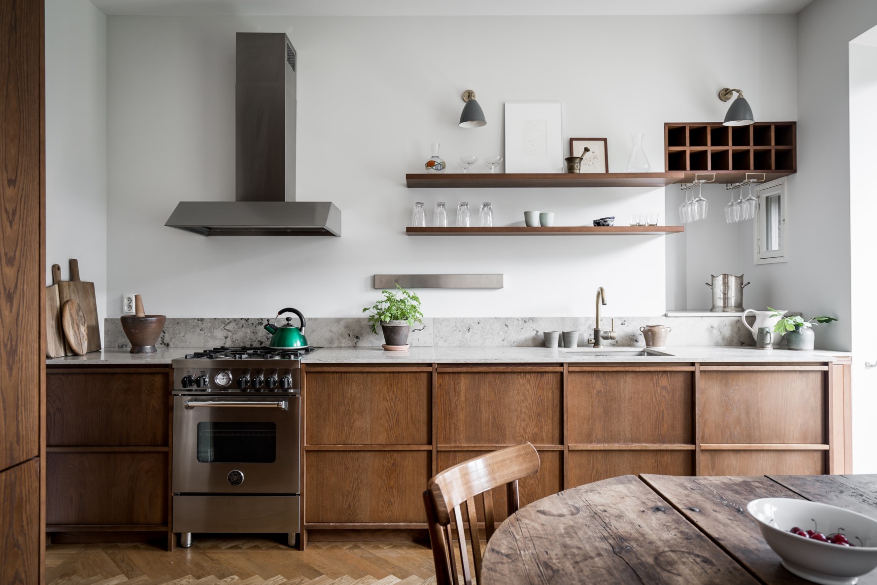 Det kunde vara ett kök någon annanstans i fjärran när skuggspel i drömskt dröjande ljus skimrar genom balkongens pardörrar över det rustikt minimalistiska köket med naturen som inspiration. Det platsbyggda köket från Nordiska kök kläds i varm mörkbetsad ek som tillsammans med kalkstenbänkskivan framhäver naturmaterialens harmoniska/jordiga balans och skapar en tidlös oas för hemmets hjärta. De starka kontrasterna skapar dynamik som gör köket unikt och personligt. Genom att låta material stå i kontrast till varandra fylls rummet med identitet och det vackra i minimalismen förstärks. Ett linjärt, naturinspirerat träkök med utanpåliggande ramverk i varma jordiga toner och eleganta detaljer. Kombinerad kyl och frys är integrerat bakom trädörrarna placerade i högskåp. Snickerierna består i huvudsak av underskåp med låda på skenor där förvaringsmöjligheterna är genomtänka med bland annat måttanpassade besticksatser helt efter lådans bredd för att optimera funktionen. I övrigt finns två dekorativa hyllplan och vitrinhängning, tydligt och funktionellt. Kökets mittpunkt förstärker det rustika intrycket som sätter den rätta finishen är den italienska gasspisen i rostfri design från Bertazzoni.