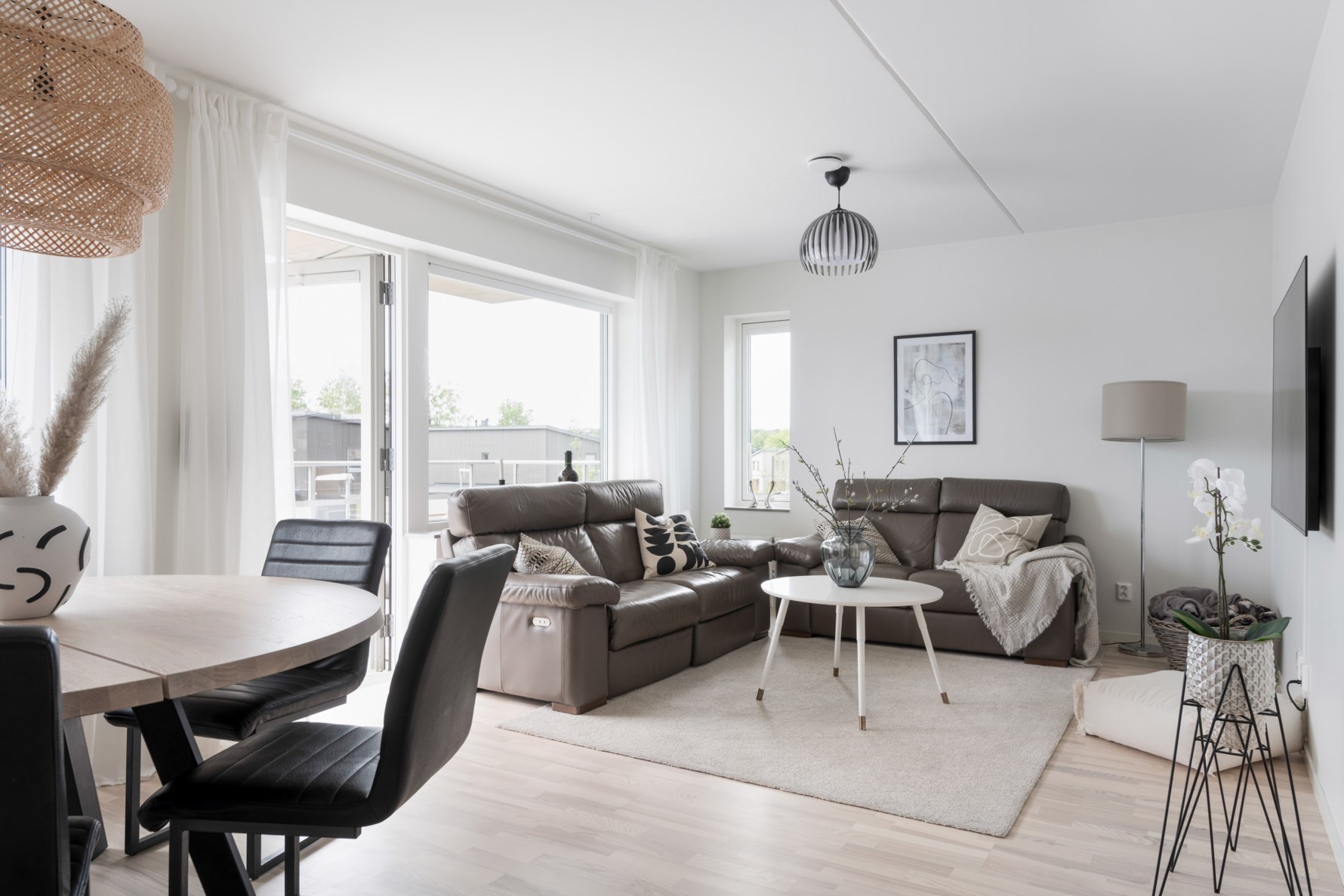 I öppen planlösning mot köket ligger vardagsrummet. Här kan möbleras med soffgrupp, soffbord och TV. Från detta rum nås den väl tilltagna balkongen som ligger belägen i sydvästläge.