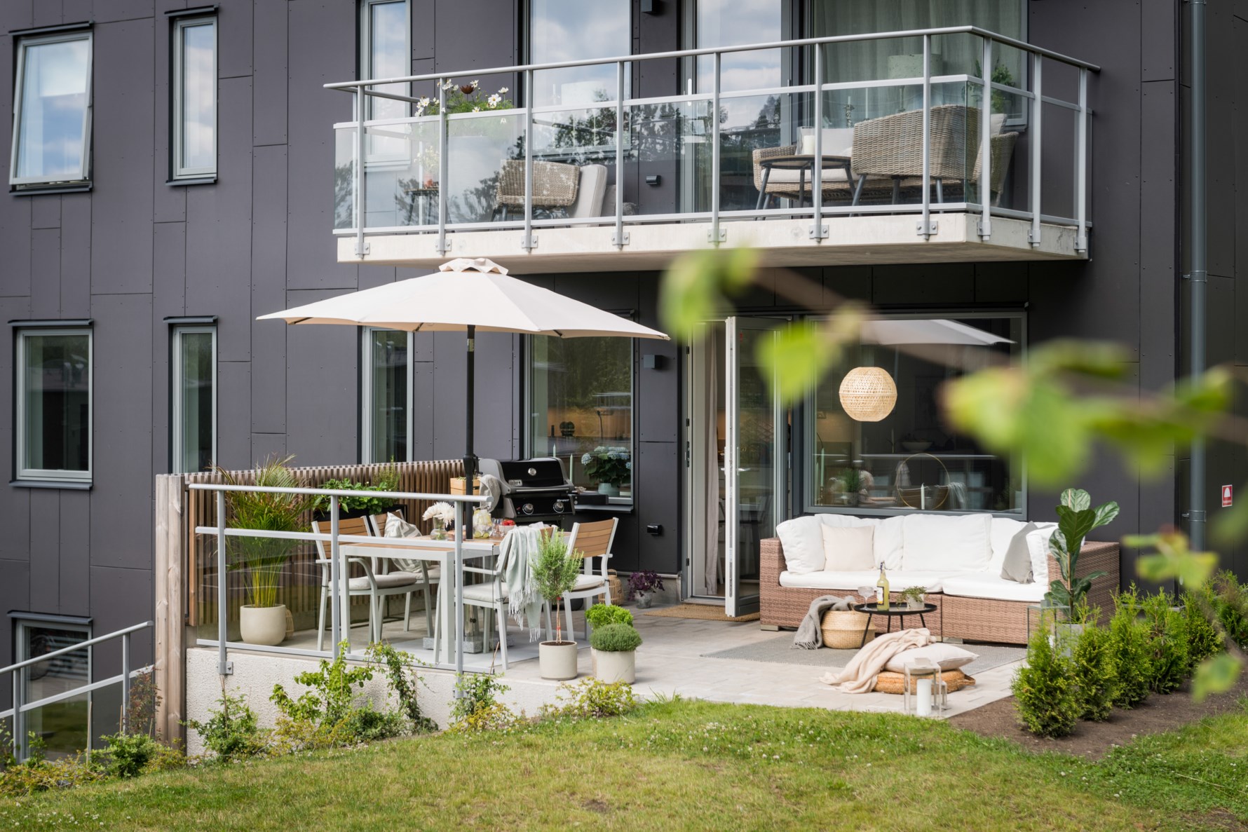 Den öppna planlösningen mellan vardagsrum och kök inger en känsla av rymd med valmöjligheter till er inredning och disponeras efter sin sociala karaktär. Härifrån nås den härliga uteplatsen som blir ett med naturen, en utsökt tillgång under året!