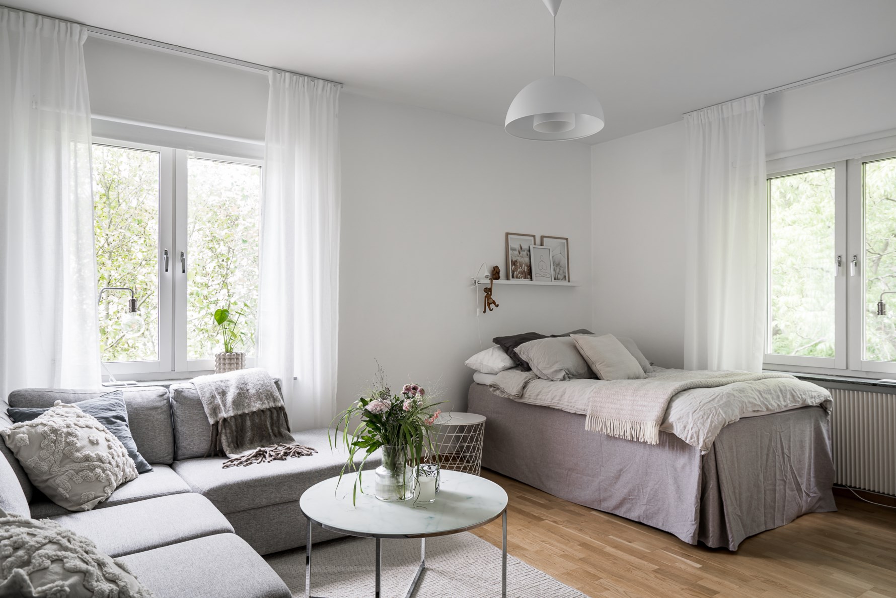 Underbart allrum som har ett eftertraktat gavelläge med ljusinsläpp från fönster i två väderstreck som har utsikt mot grönska samt ner mot Härlanda. Allrummet kan inredas med soffa och säng och här finns även bra förvaringsmöjligheter i en skjutdörrsgarderob. Golvet kläs av parkett och väggarna är målade i vitt.
