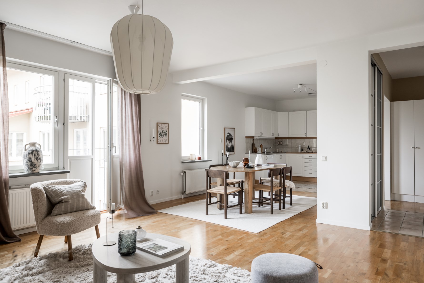 Innanför ytterdörren möts ni av en hall med goda förvaringsmöjligheter i form utav fyra garderober. Precis innanför ytterdörren ligger praktiskt klinkergolv som sedan övergår till ekparkett som sträcker sig i resterande av bostaden förutom i köket där det ligger klinker.