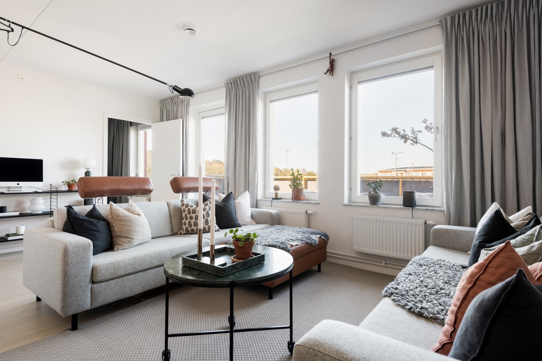 Den öppna planlösningen mellan vardagsrum och kök inger en känsla av rymd och ger valmöjligheter till er inredning. En härlig och väldisponerad yta med sociala karaktär, något som genomsyrar hela bostaden. I anslutning finns den härliga balkongen som kan inredas med loungemöbler, middagsbord, grill och växter.