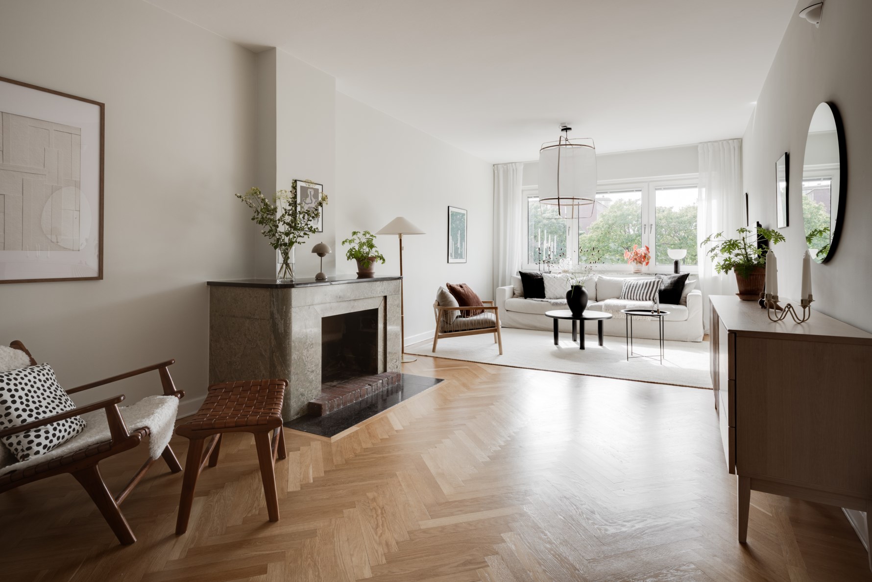 Underbart ljust och härligt vardagsrummet som är generöst tilltaget med gott om plats för både soffgrupp och matsalsbord. Rummet präglas av en tidstypisk öppen spis samt ett generöst fönsterparti helt fritt från insyn med grönskande utsikt. På golvet ligger vacker fiskbensparkett som är slipad och lackad 2021 och väggarna är målade i Jotuns färg Lady Tidlös.