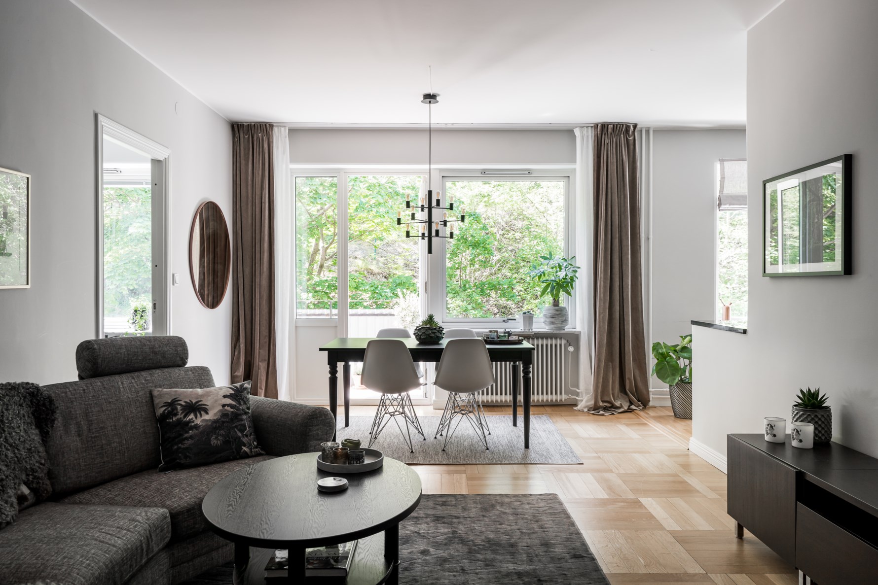 Vidare in i lägenheten når du det rymliga vardagsrummet där det ryms både en soffgrupp och matsalsbord för större sällskap. Väggar målade i Nordsjö HoP Greige och parkettgolv i original. Härlig ljus känsla med rikligt ljusinsläpp från de stora fönsterpartierna och härifrån når du även lägenhetens balkong som ligger i sydväst. Balkongen rymmer en mindre balkongsoffa samt bord. Från balkongen samt alla lägenhetens fönster har du utsikt mot grönska i skogspartiet på baksidan av huset.