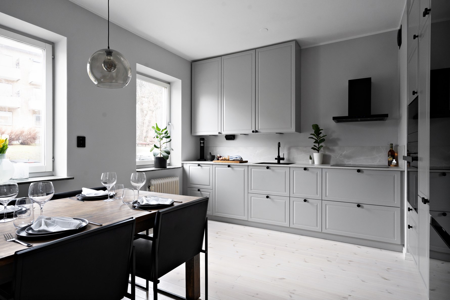Det nyrenoverade köket från 2023 är hemmakockens dröm. Här finns de moderna bekvämligheter och stilfulla detaljer, två fönsterpartier bidrar med härligt ljusinsläpp. Köksinredningen i grått kombineras med ljus laminatskiva och svarta detaljer. Väldigt goda förvaringsmöjligheter i flertalet över - och underskåp samt ett stort skafferi. Den maskinella utrustningen består av induktionshäll, inbyggnadsugn, inbyggnadsmikro, köksfläkt, integrerad diskmaskin samt kyl och frys. Här finns ypperligt med plats för ett köksbord för flera personer.