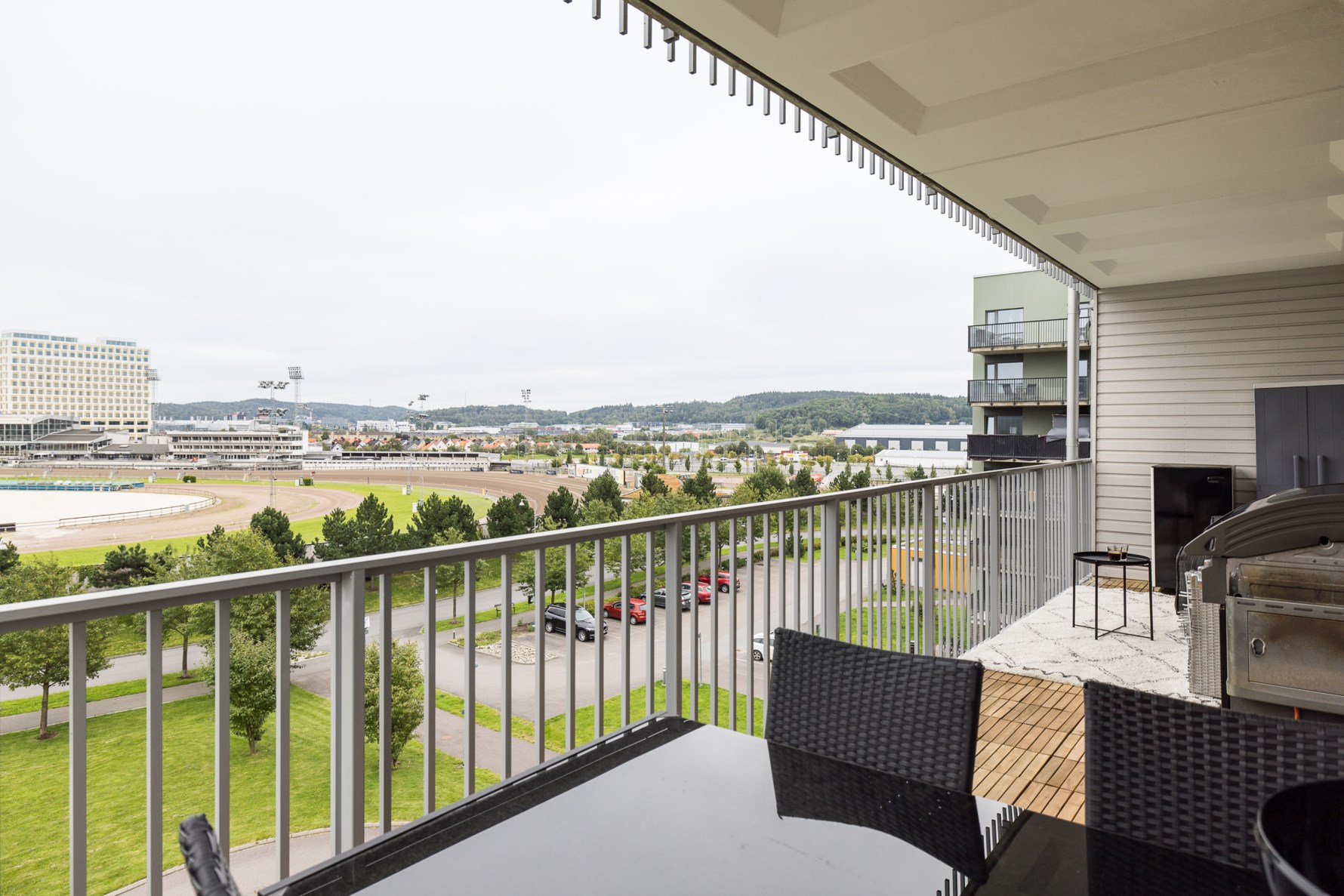 Det mindre sovrummet kan även inredas som arbetsrum och här finns förvaringsmöjligheter i en garderob. Härligt ljusinsläpp och utgång till bostadens väl tilltagna balkong som har förstklassigt läge för den travintresserade då det är fri utsikt över Åby travbana. Balkongen kan inredas med både matplats och loungegrupp.