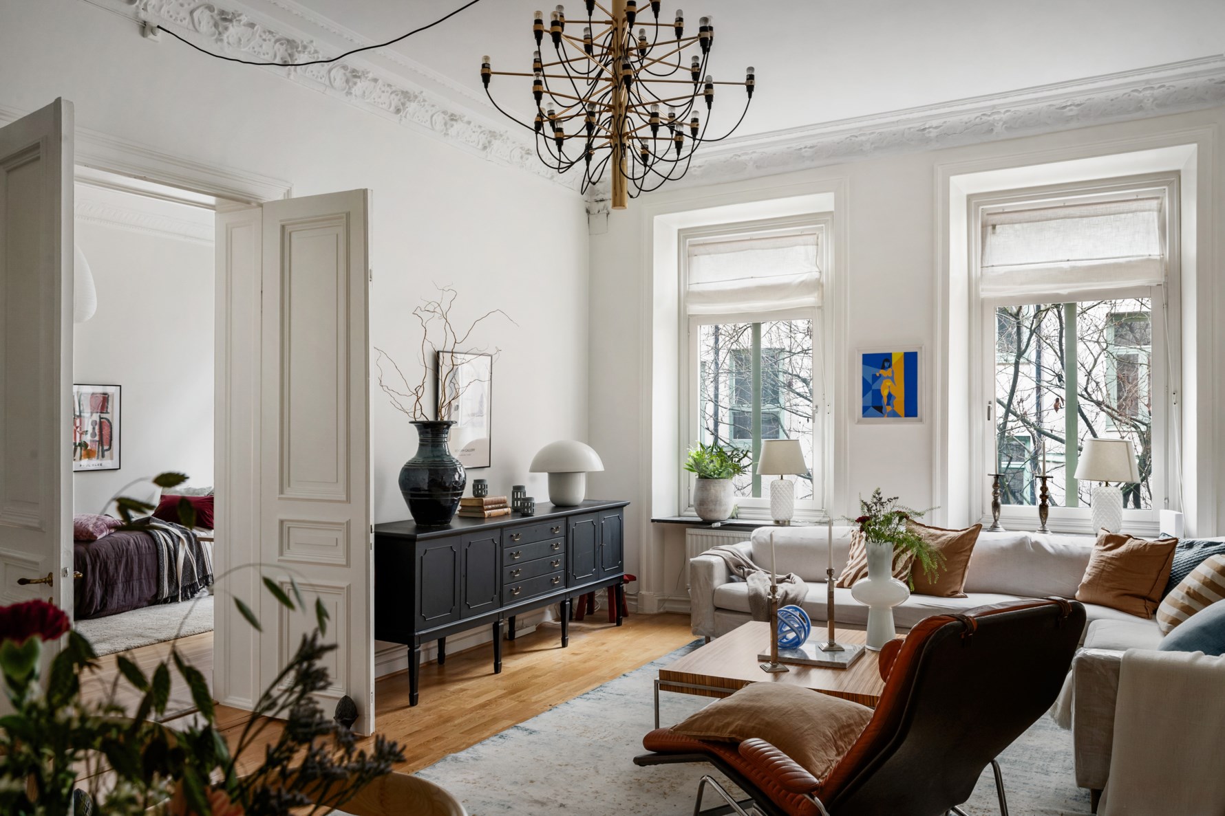 Vackra pardörrar leder er vidare till vardagsrummet som även det stoltserar med tidstypiska sekelskiftesdetaljer som stuckatur, takrosett, profilerade lister och spegeldörrar. Golvet kläs av ekparkett och väggarna är målade i Karlssons vit. Vardagsrummet är generöst utformat och kan inredas med både soffgrupp och matsalsbord. Två fönster med överljus förser rummet med ljus.