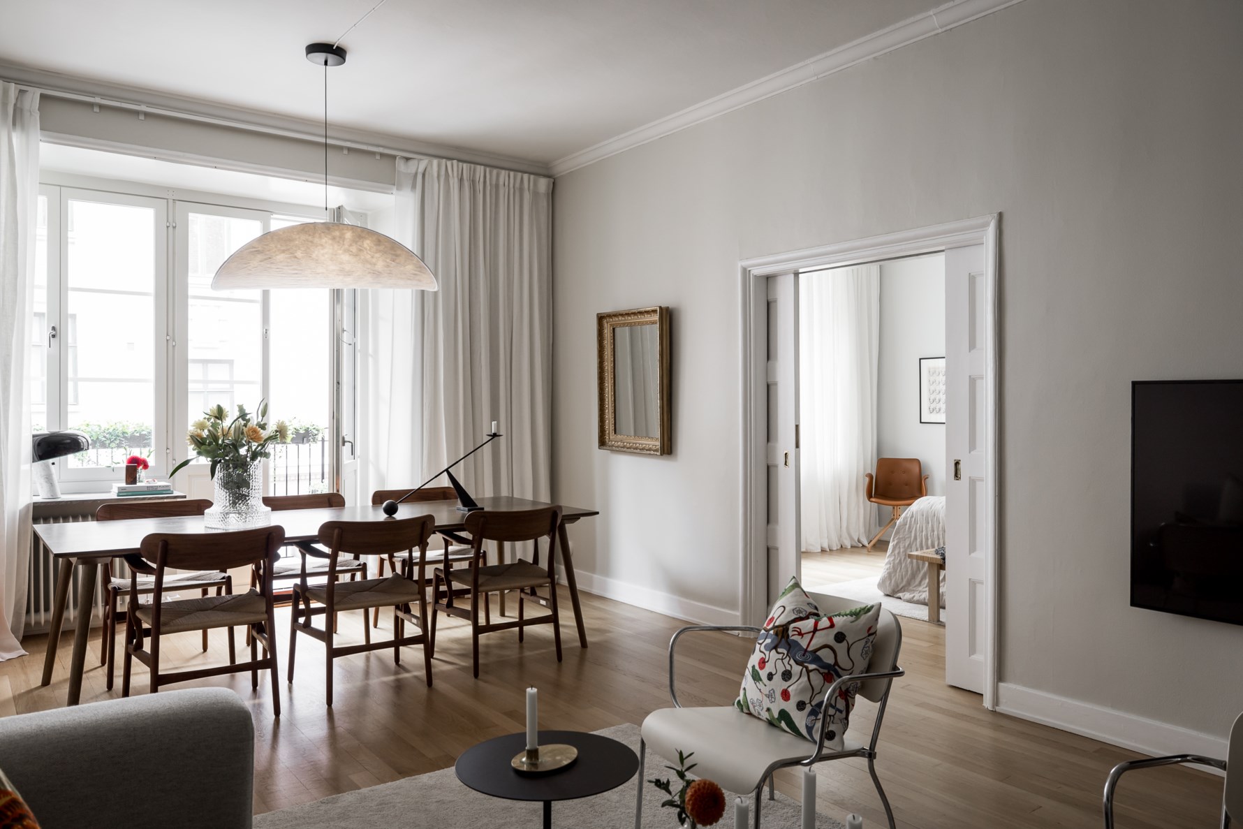 Innanför ytterdörren möts ni direkt av den slående takhöjden i hallen som är genomgående för hela bostaden. Hallen har goda förvaringsmöjligheter i två rymliga platsbyggda garderober samt plats för fri avhängning. Golvet kläs av ekparkett i original och väggarna är målade 2022 i Jotun Space.