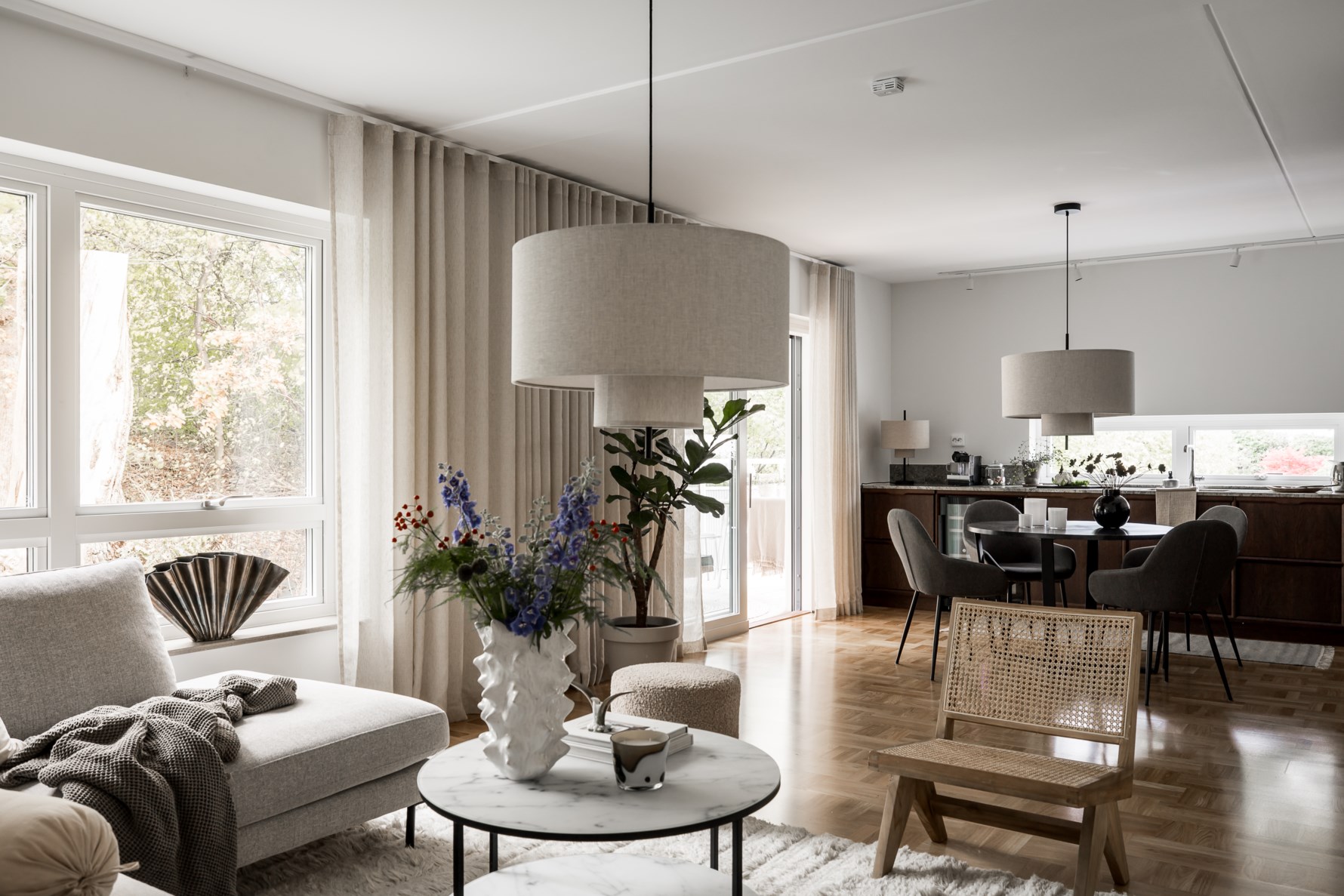 Vidare in i lägenheten möts ni av den trevliga sociala planlösningen med kök och vardagsrum i öppet samband. Rummet kan inredas med både soffgrupp, matsalsbord samt övrigt möblemang. Rummet har gavelläge och erbjuder fantastiskt ljusinsläpp från flertalet fönster samt utgången till en av bostadens två härliga balkonger. Balkongen kan inredas med både loungemöbler och ett mindre bord med stolar.