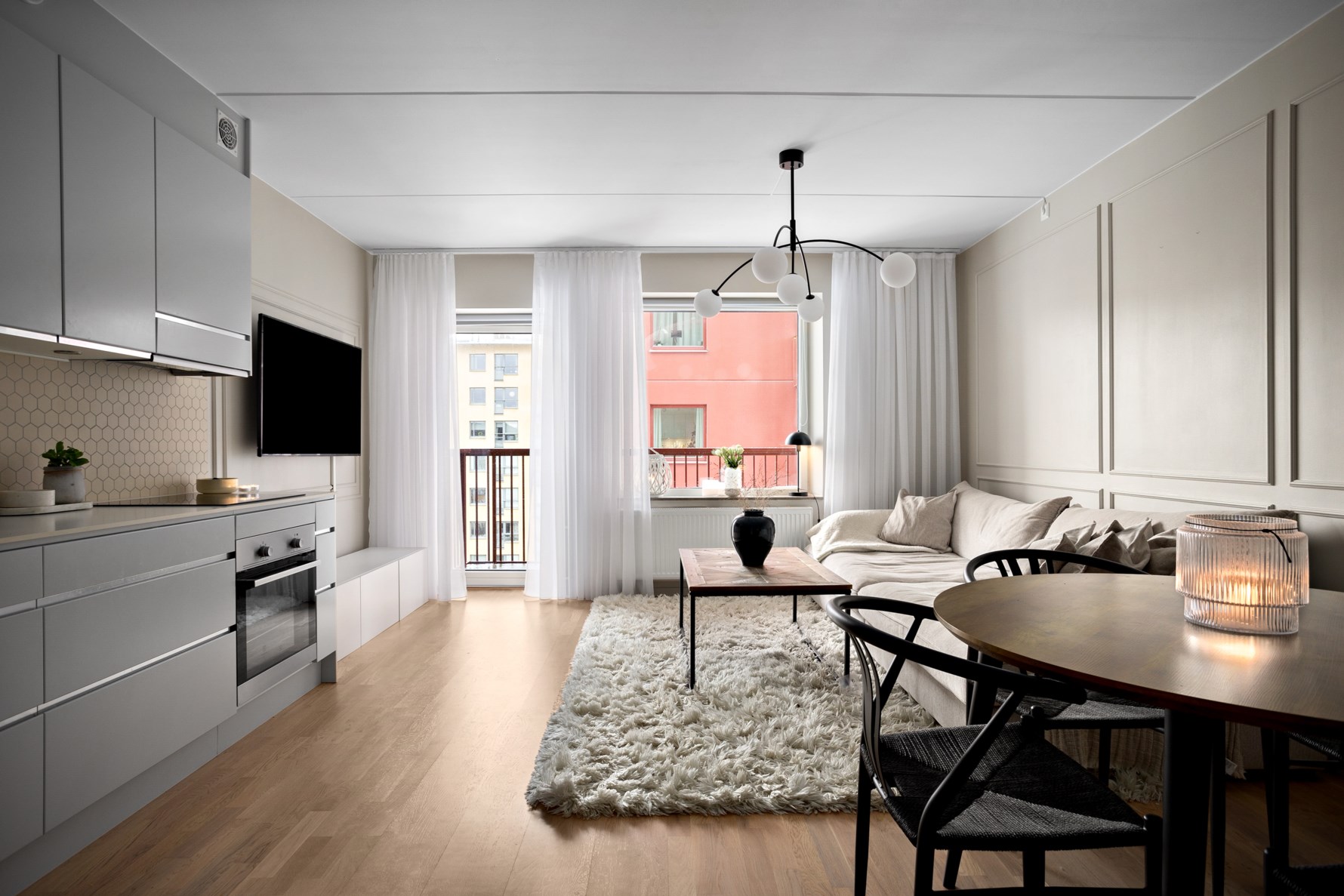 Ljusa och luftiga sällskapsytor med öppen disposition mot köket. Fint ljusinsläpp tack vare ett stort fönsterparti samt en balkongdörr helt i glas. Balkongen är väl tilltagen och kan möbleras med stolar och bord. Vardagsrummet kan möbleras med en soffgrupp och matsalsbord.