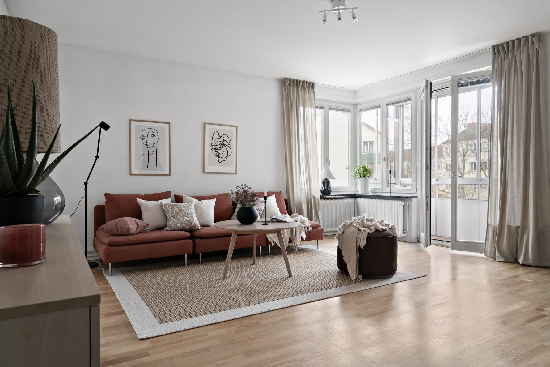 Vardagsrummet är väl tilltaget med generösa ytor som bjuder in till en rad olika möbleringsalternativ med soffa, matsalsbord och övrigt möblemang. Från vardagsrummet når du den härliga inglasade balkongen och en rofylld grönskande vy.
