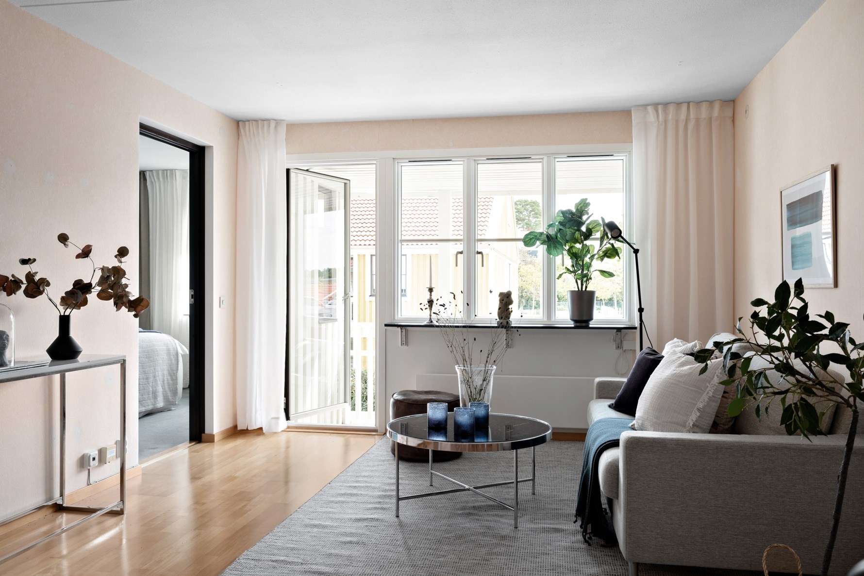 Ett rymligt vardagsrum med god plats för soffgrupp med tv-möbel. Från vardagsrummet når man balkongen med morgon/förmiddagssol. Balkongen rymmer loungegrupp och bord som bjuder in till umgänge och avkoppling. Lägenheten har genomgående neutrala väggar vilket gör den enkel att inreda efter tycke och smak.